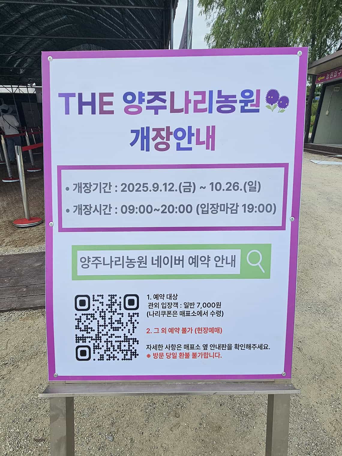 √첫 번째, 입장료는 비싸지 않아요. 일반 성인은 7천원(5천원 나리농원 상품권으로 환불), 양주시민은 1천원이랍니다. 입장권 줄이 긴 경우엔 무인발권기를 이용하면 더 빠르게 입장할 수 있어요.