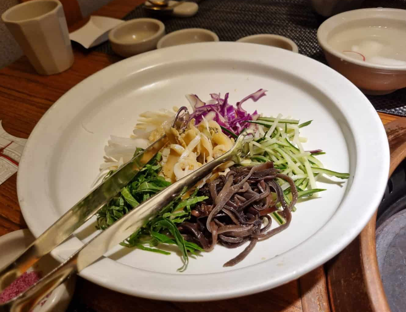 이날 우리는 생갈비세트를 주문했어요. 코스는 야채죽과 물냉면으로 가볍게 입맛을 돋우며 시작했답니다.