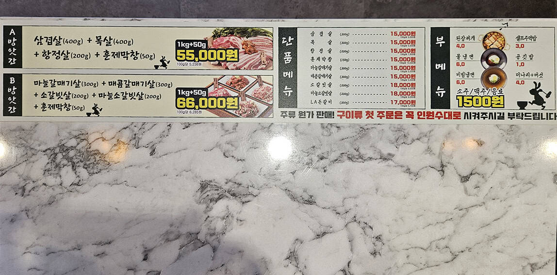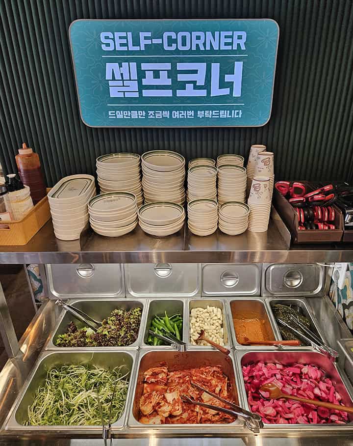실내는 꽤 넓어서 단체 회식이나 모임을 하기에도 안성맞춤이더라고요. 테이블 간 간격도 넉넉해서 옆사람 눈치 안 보고 고기 구워 먹기에 딱! 특히 매장 한쪽에 깔끔한 셀프코너가 있어서 필요할 때마다 추가 반찬을 자유롭게 가져갈 수 있었던 점도 맘에 들었어요.