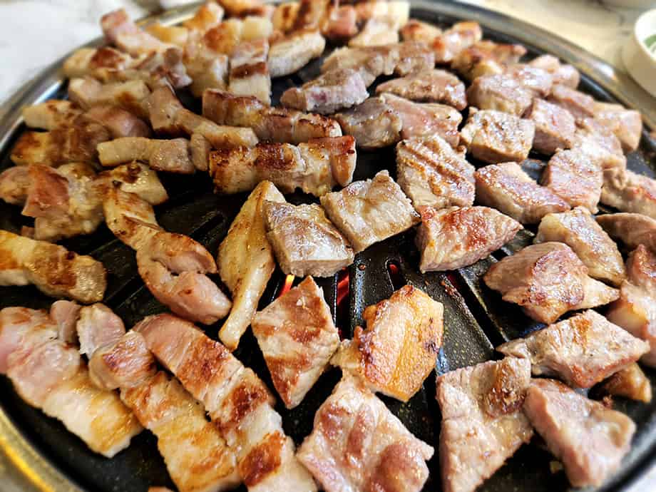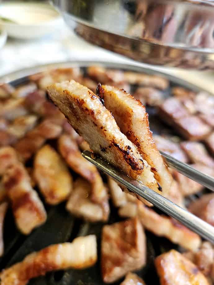 고기를 구우면서도 "이거 진짜 실화야?"라는 말이 자동으로 나왔어요. 첫 번째로 삼겹살과 목살을 올리자 불판 위에서 지글지글 소리가 귀를 사로잡았어요. 두툼한 목살은 풍부한 육즙이 입안에 터지고 항정살은 부드럽고 고소한 풍미가 압권이었어요. 특히 삼겹살은 많이 먹어도 느끼하지 않아서 정말 좋더라고요.