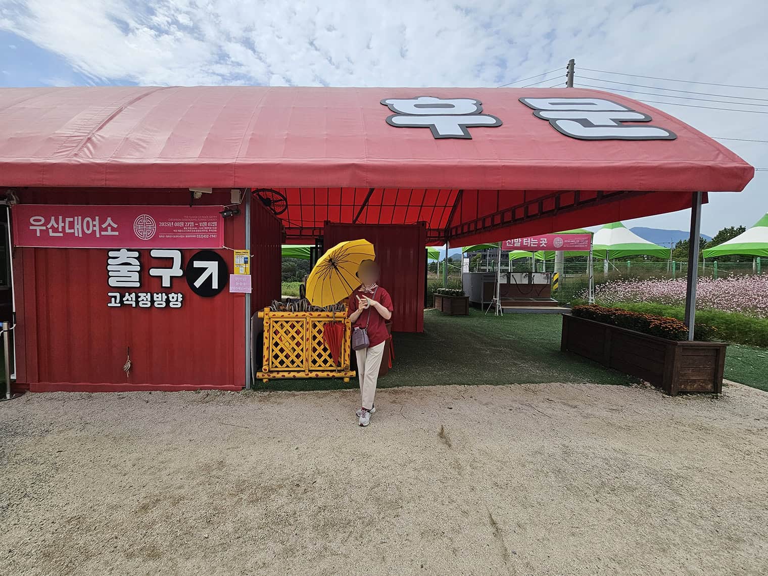 다행히 행사장에서 아름다운 배려가 있었어요, 양산을 가져오지 못해서 필요하신 분은 노란색, 빨간색 양산도 무료로 빌려드린답니다.
