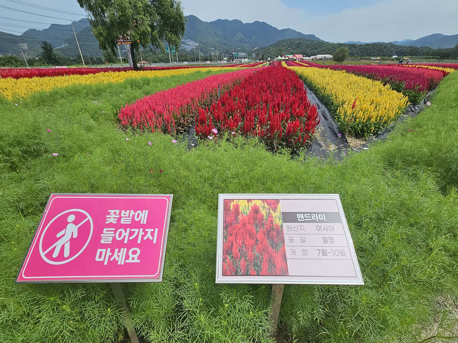 꽃밭입구에 들어서는 순간 대박, 절로 감탄사가 터졌어요. 다양한 꽃들이 아름답게 만개한 모습이 정말 장관이었답니다. 특히 코스모스와 촛불 맨드라미 군락은 가을 정취를 제대로 느끼게 해줬어요.