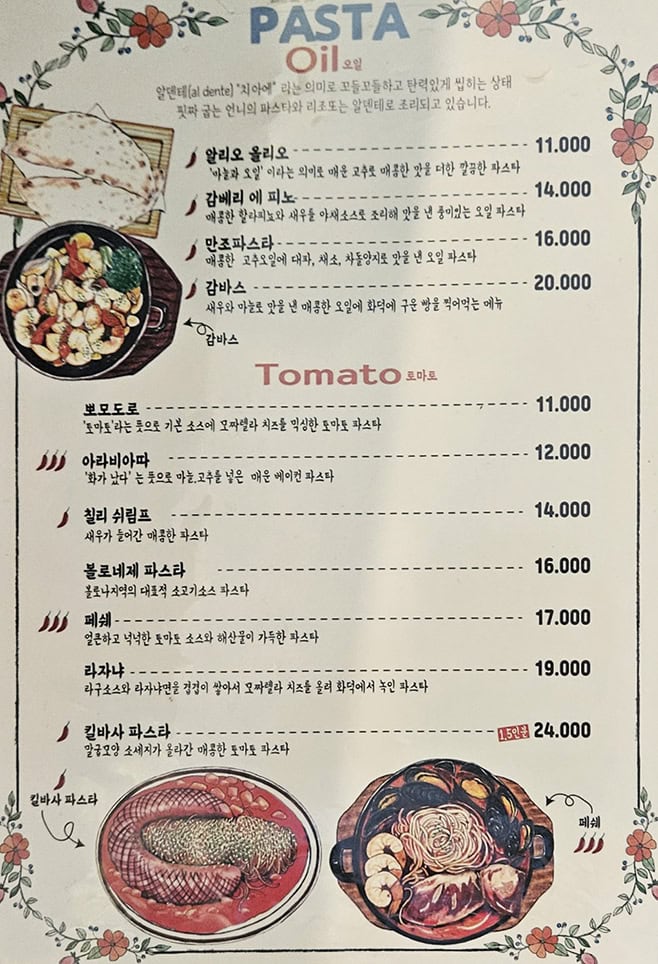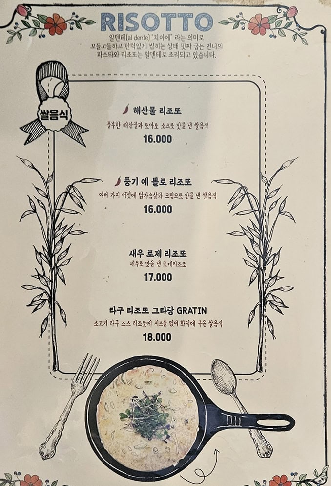 파스타, 샐러드, 리조또 메뉴판