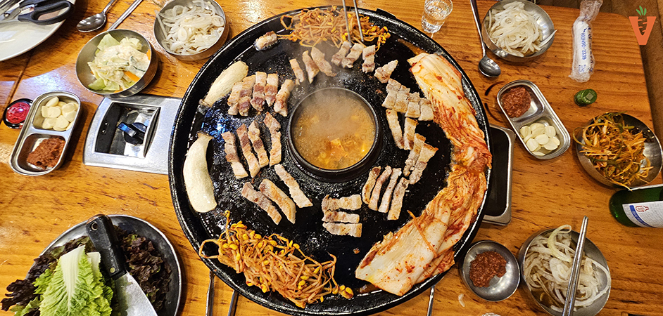고기를 구워 먹으면서 된장찌개를