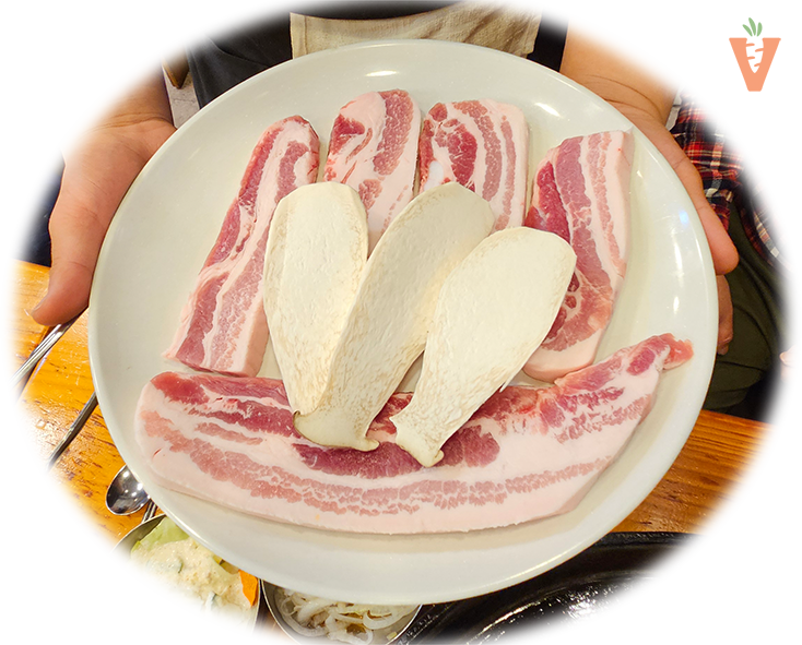 뜨거워진 솥뚜껑에 고기와 새송이 버섯을