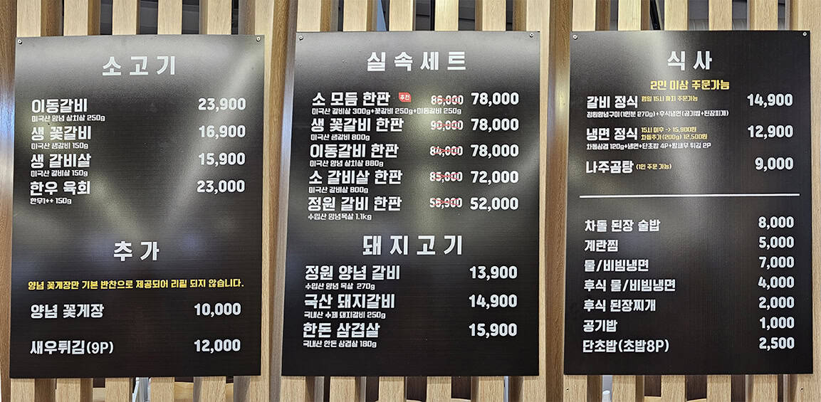 *메뉴(대표) : 소 모듬 한판 78,000원, 이동갈비 한판 78,000원, 생 꽃갈비 한판 78,000원
