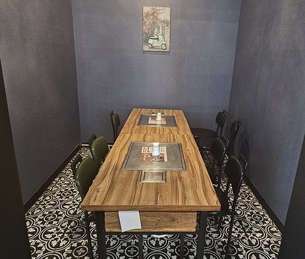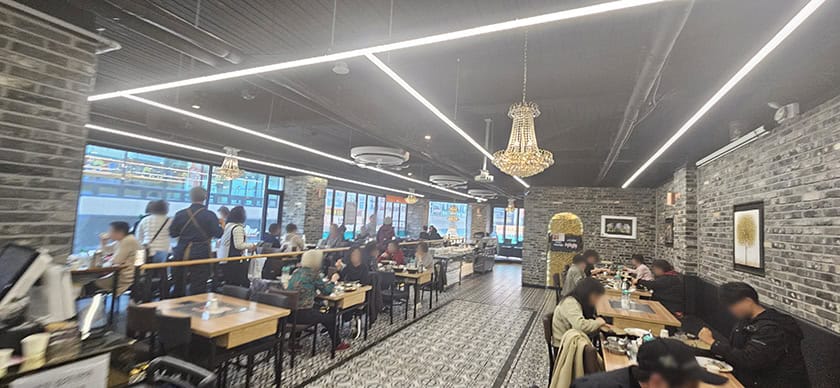 도착하자마자 건물 외관에서부터 뭔가 깔끔하고 고급진 분위기가 느껴졌어요. 입구에 들어서니 나무와 돌로 장식된 짜임새 있는 인테리어가 눈에 확 들어오더라고요. 시선을 사로잡은 건 내부 공간! 엄청나게 넓고 테이블 사이 간격이 넉넉해서 프라이빗한 식사가 가능했어요.