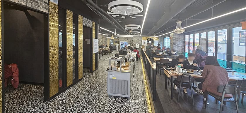 도착하자마자 건물 외관에서부터 뭔가 깔끔하고 고급진 분위기가 느껴졌어요. 입구에 들어서니 나무와 돌로 장식된 짜임새 있는 인테리어가 눈에 확 들어오더라고요. 시선을 사로잡은 건 내부 공간! 엄청나게 넓고 테이블 사이 간격이 넉넉해서 프라이빗한 식사가 가능했어요.