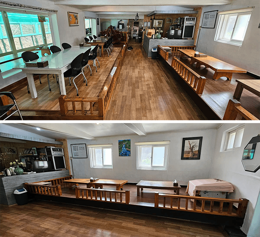 테이블도 입식과 좌식으로 배치도 눈에 띄게 신경 쓴 흔적이 보였어요. 특히, 밖으로 보이는 풍경이 예뻐서 어디 앉아도 기분 좋은 식사를 즐길 수 있을 것 같더라고요. 무엇보다 감자수제비 냄새가 식당부터 은은하게 퍼져서 괜히 더 설레었답니다.