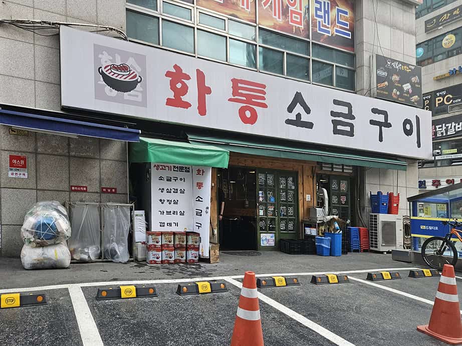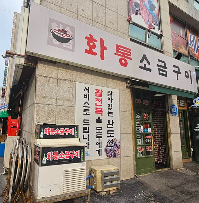 창동역 화통소금구이는 위치부터가 꿀이에요. 창동역 1번 출구로 나와서 KT 건물 방향으로 우회전하면 식당들이 쭉~ 보이는데, 그 골목 끝에서 만날 수 있어요. 가게가 모퉁이에 있어서 금방 눈에 띄더라고요.