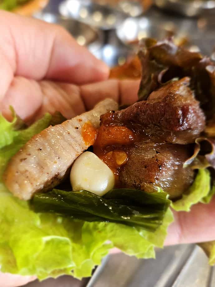반찬도 깔끔했어요. 상추, 깻잎, 양파절임, 명이나물, 상추 겉절이 등 기본적인 구성인데 하나같이 신선해서 고기랑 찰떡이었어요. 특히 명이나물에 싸먹으면 정말 꿀맛이었답니다! 고기 찍어먹는 소스도 다양했는데, 개인적으로는 소금이 가장 고기맛을 잘 살렸어요.