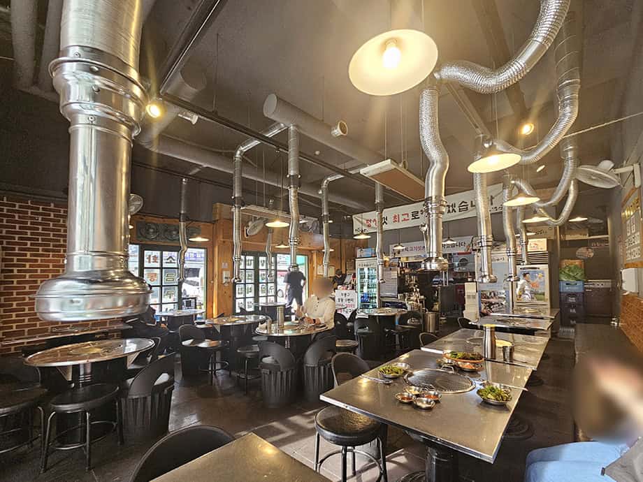 창동역 화통소금구이 매장에 들어서는 순간 느껴지는 향긋한 숯불 냄새! 이건 이미 믿고 먹을 수 있는 맛집 확정이죠. 매장은 원형통 테이블이 대부분이라 대포집 느낌도 나고, 벽쪽 테이블은 직사각형으로 돼 있어서 좌석 구성도 꽤 다양해요.