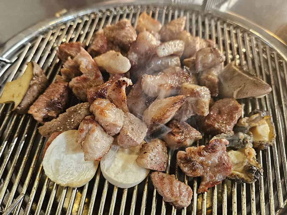 고기 구울 때 처음엔 직원분이 직접 돕는데, 고기 굽는 손길이 엄청 섬세했어요. 간격을 맞춰 뒤집어주고, 적당히 익으면 한 입 크기로 잘라주시는데 정말 맛있게 익더라고요.