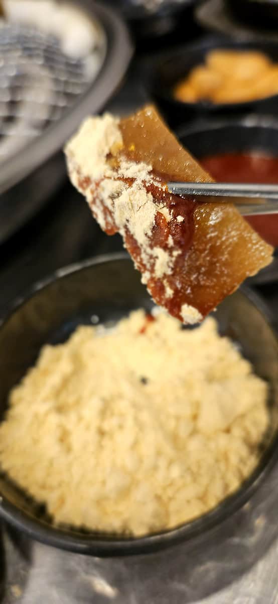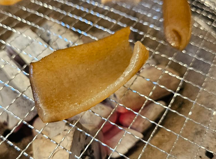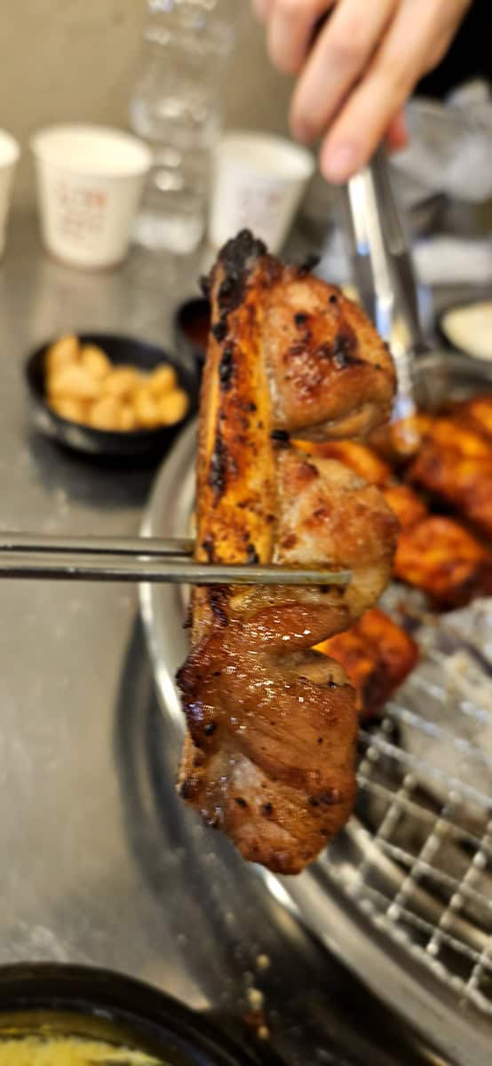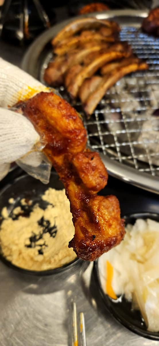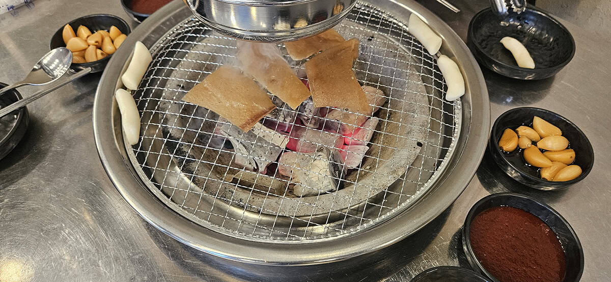 고기는 초벌 구이가 된 상태로 나와 불 위에서 살짝 익혀 먹을 수 있어 간편했어요. 처음에는 꿀팁 하나 알려드리자면, 기본 제공되는 돼지껍데기와 떡을 먼저 구워 드시면 괜찮은 대기 시간이 됩니다.