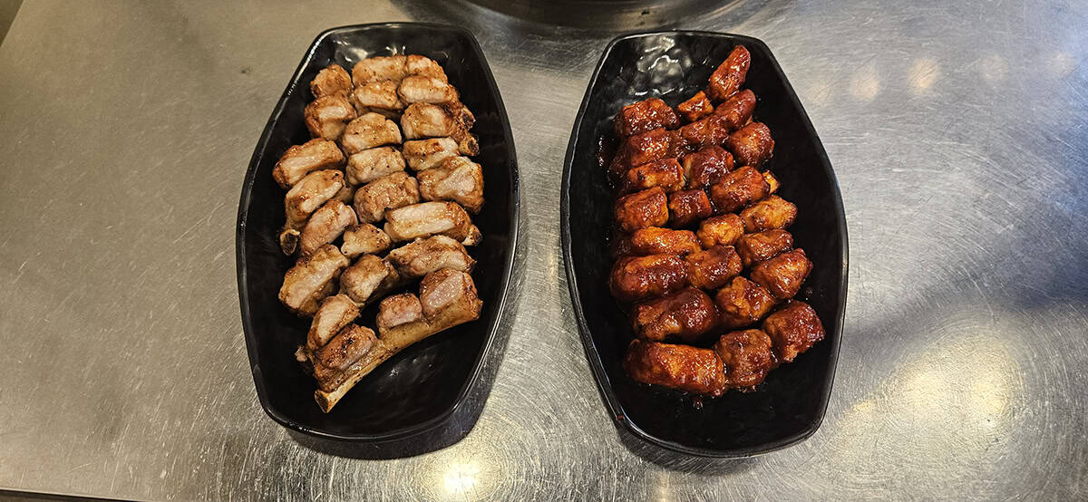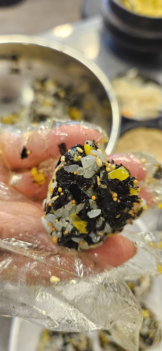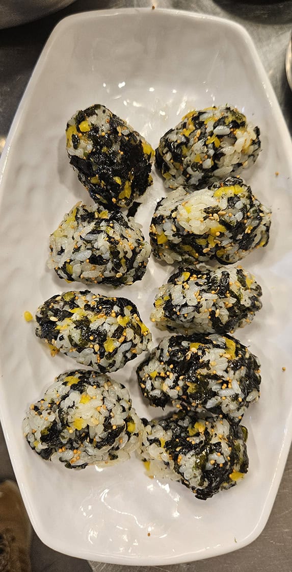 양념된 쪽갈비와 매운 쪽갈비를 먹으니 당연히 매운맛을 잡아줄 사이드가 생각나더라고요. 바로 '주먹밥'과 '잔치국수'인데요, 매운맛 쪽갈비와 함께 주먹밥을 한 입 먹으면 매운맛이 적당히 중화되면서 밸런스가 기가 막혔어요.