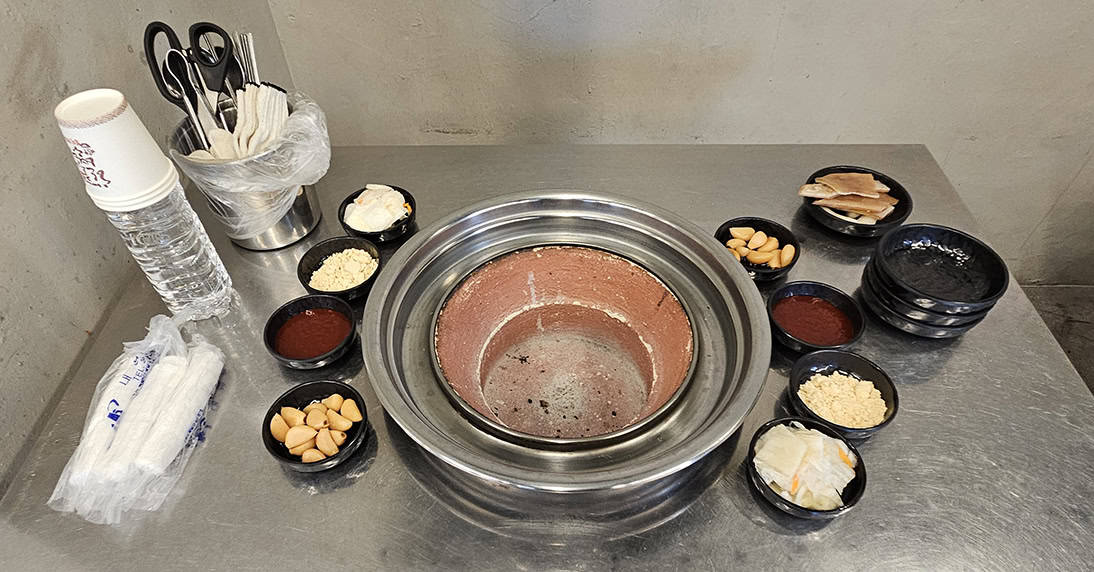 사이드메뉴로는 기본 주먹밥, 매운 주먹밥, 잔치국수, 누룽지가 준비되어 있고, 기본 찬으로 백김치, 마늘장아찌, 고소한 콩가루, 그리고 특제 매운 소스가 나와요. 특히 기본 찬들이 고기랑 굉장히 잘 어울려서 위 다른 게 필요 없을 정도랍니다.
