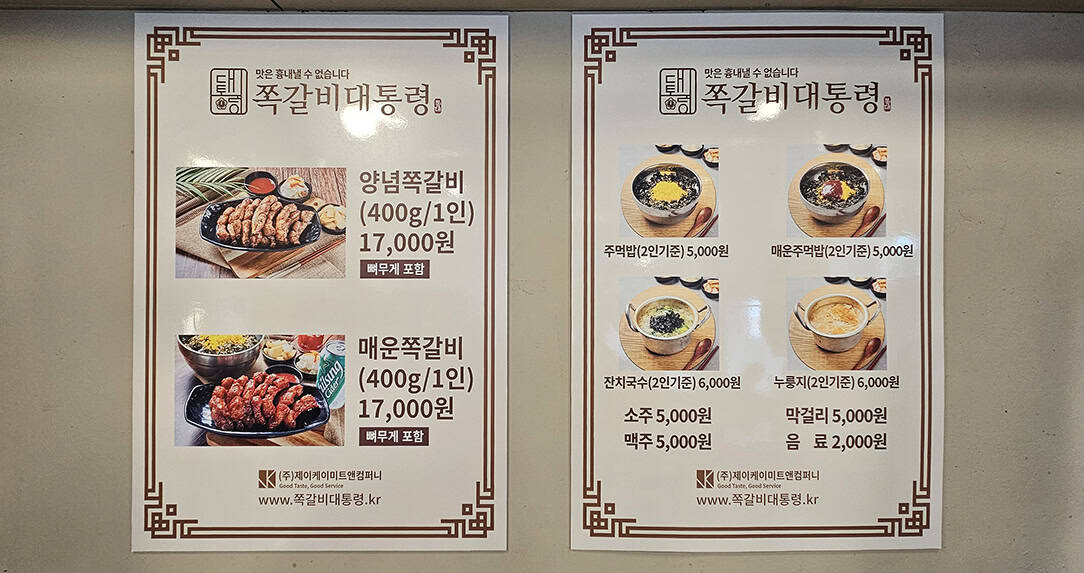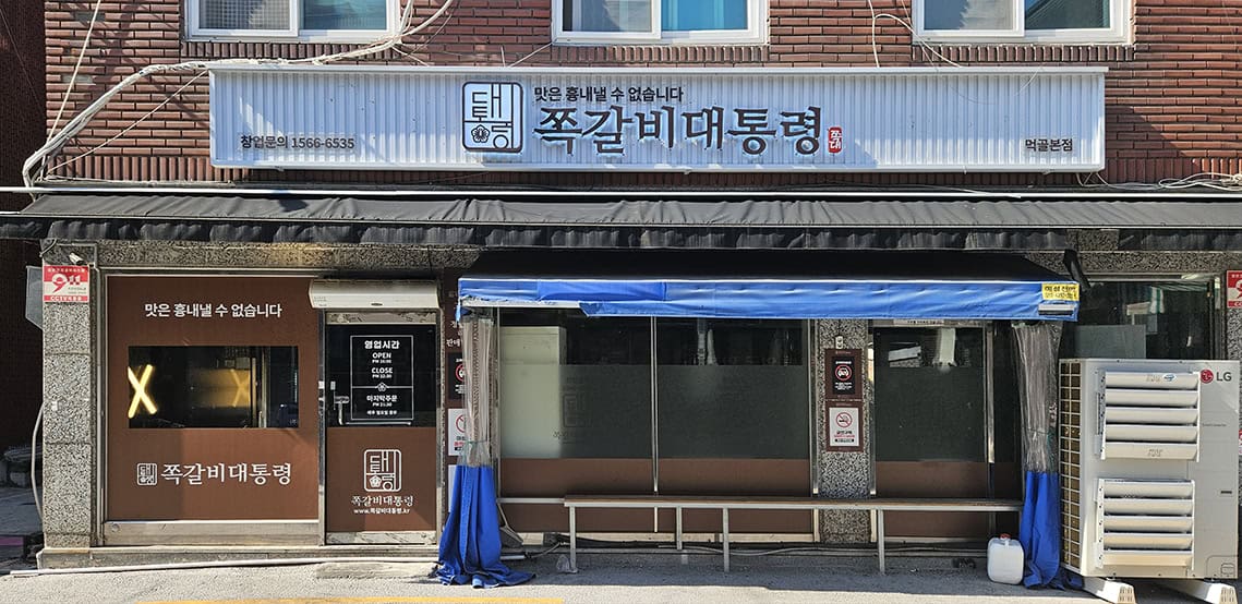쪽갈비대통령 먹골본점 외관은 간단하지만 강렬했어요. “맛은 흉내 낼 수 없습니다.”라는 문구가 적힌 간판이 첫인상부터 자신감을 보여주더라고요. 문을 열고 들어가면 숯불 향기와 고기 굽는 냄새가 코를 자극하면서 기대감이 쑥쑥 올라갔어요.