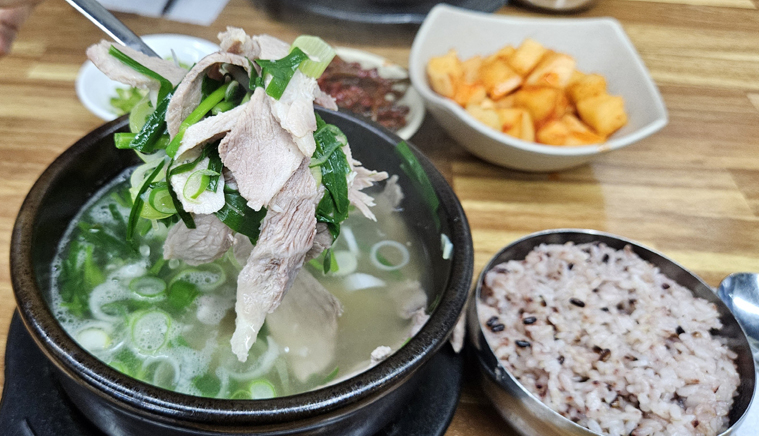 식사를 하면서 고개의 깊은 탄성이 계속 나왔어요. 특히 국물! 따뜻한 국물 한 숟가락 떠먹자마자 맑은 돼지 육수의 맛이 그대로 전해지는 게 너무 좋았어요. 양도 상당히 넉넉해서 남길 걱정 없이 배 터지게 즐길 수 있었어요. 반찬도 맛있었지만 가장 특별했던 건, 마늘보쌈처럼 졸여진 고기와 흑미밥 조합이란 점이에요. ‘흑미가 국밥에 이렇게 잘 어울릴 줄이야’라는 생각이 절로 들었답니다.