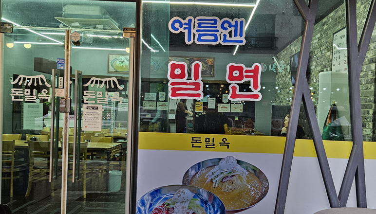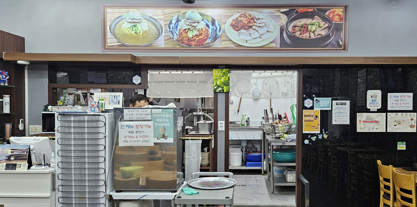 가게에 도착하자마자 간판부터 식욕 돋게 하는 글씨들이 눈에 딱 띄더라고요. "국밥! 밀면!" 이라는 글씨로 계절감을 이야기해줘서 너무 센스 있다는 생각이 들었어요. 가게 외부는 깔끔하고 심플하면서도 지나가는 사람들의 발걸음을 멈추게 할 만한 매력이 있어요.