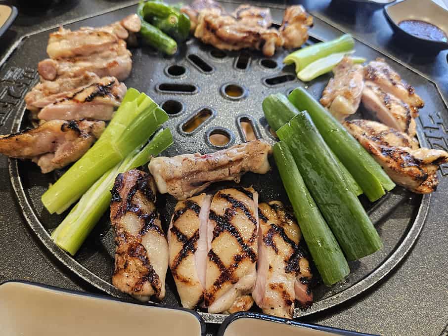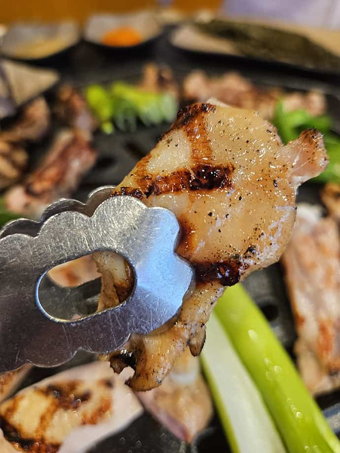 메인 요리인 숯불 닭갈비가 멋진 비주얼로 직접 초벌 되어 나왔어요. 달궈진 팔각형 불판 위에 놓이자마자 나는 숯불 향이 처음부터 마음을 사로잡더라고요. 직원분이 큼지막한 대파와 꽈리고추까지 함께 어느정도 익을 때까지 구워주셨는데, 이런 부재료들이 닭갈비와 찰떡임을 실감했어요.