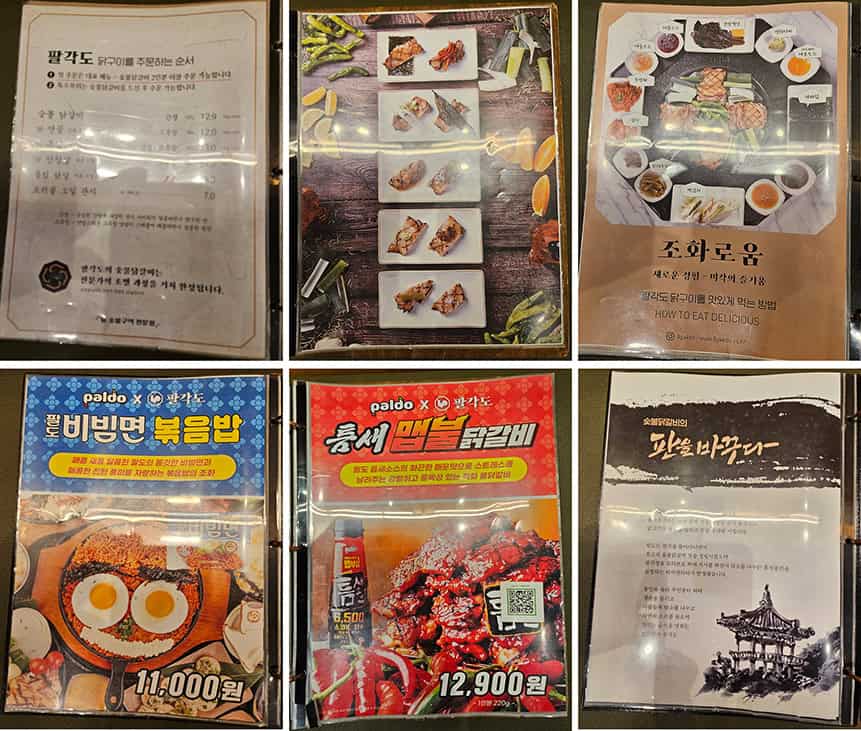 또 메뉴판에는 모든 부위별 설명이 상세히 나와 있어서 처음 주문하는 사람에게도 친절한 느낌이었죠. 한 가지 팁을 드리자면 첫 주문은 꼭 숯불 닭갈비 2인분 이상만 가능한데, 이다음부터는 원하는 특수 부위를 추가하실 수 있어요. 만약 가신다면 사이드로 팔도 비빔면 볶음밥을 꼭 추가하세요!