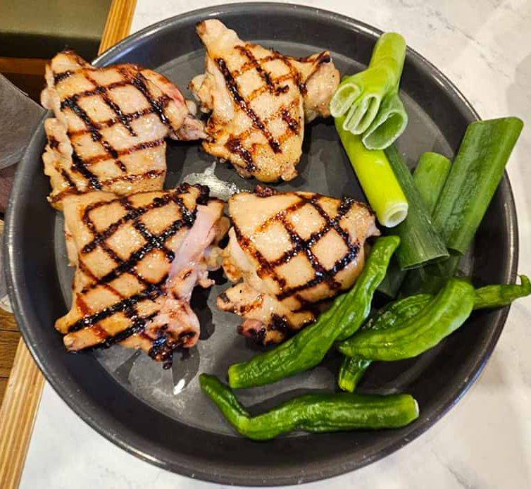 메인 요리인 숯불 닭갈비가 멋진 비주얼로 직접 초벌 되어 나왔어요. 달궈진 팔각형 불판 위에 놓이자마자 나는 숯불 향이 처음부터 마음을 사로잡더라고요. 직원분이 큼지막한 대파와 꽈리고추까지 함께 어느정도 익을 때까지 구워주셨는데, 이런 부재료들이 닭갈비와 찰떡임을 실감했어요.