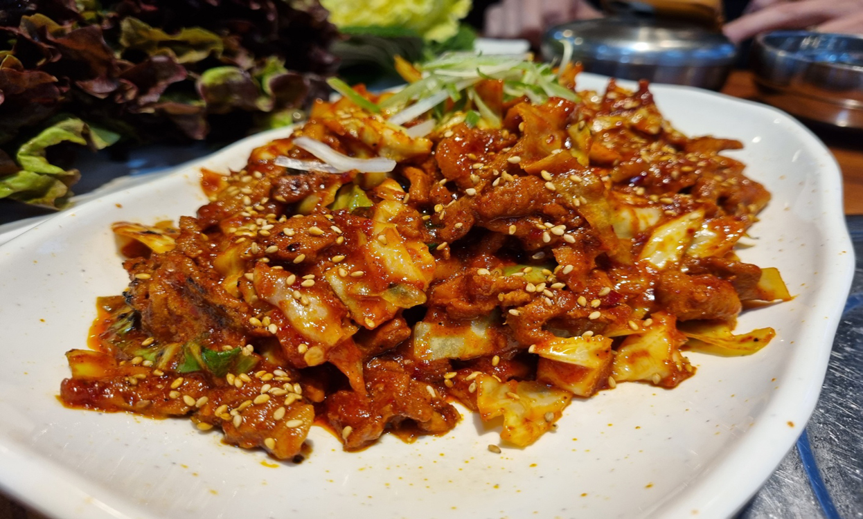 막내쌈밥의 메뉴는 정말 단순 명료했어요. 대표적으로 솥밥 정식에 직화제육볶음, 차돌된장찌개, 그리고 직화쭈꾸미가 있었는데요. 고민하다가 저는 직화제육과 차돌된장찌개를 선택했어요. 직접 직화로 볶아낸 제육은 비주얼부터 반했는데요, 진하게 배어든 양념이 한 입 먹기도 전에 입맛을 자극하더라고요. 그리고 된장은 고소함과 진한 맛이 별미였어요. 너무 자극적이지 않아서 부담 없이 먹을 수 있었어요!