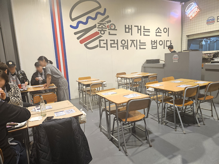 파주 바그 수제 햄버거 매장에 들어섰을 때, 첫인상이 정말 좋아서 기대감이 높아졌어요. 실내는 깔끔하고, 약간 힙한 감성도 느껴졌죠. 테이블 간 간격도 넉넉해서 가족 단위 손님들이 많았어요. 특히 오픈 키친 스타일이라 음식 준비 과정을 멀리서 볼 수 있는데, 이게 또 믿음직스럽더라구요.