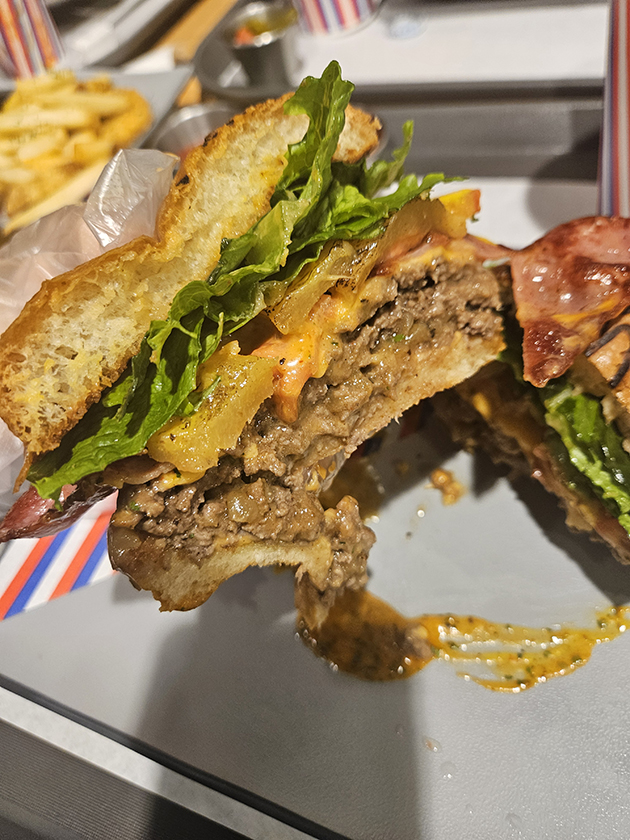 음식이 나왔을 때 비주얼부터 놀랐어요. 크기가 꽤 큰데 내용물이 빵빵하게 채워져 있어서, 한 입에 들어갈까 싶었죠. 톰스테이크바그는 버터에 바삭하게 구운 번 사이로 패티, 파인애플, 베이컨, 치즈까지 모든 게 완벽하게 쌓여 있었어요. 씹을 때마다 패티에서 나오는 육즙이 진짜 대박이었어요. 그리고 파인애플의 상큼함이 바그에까지 번져서 일반적인 햄버거에서는 상상도 못할 조화를 만들더라구요.