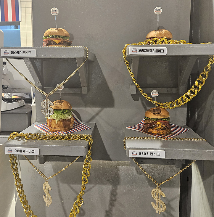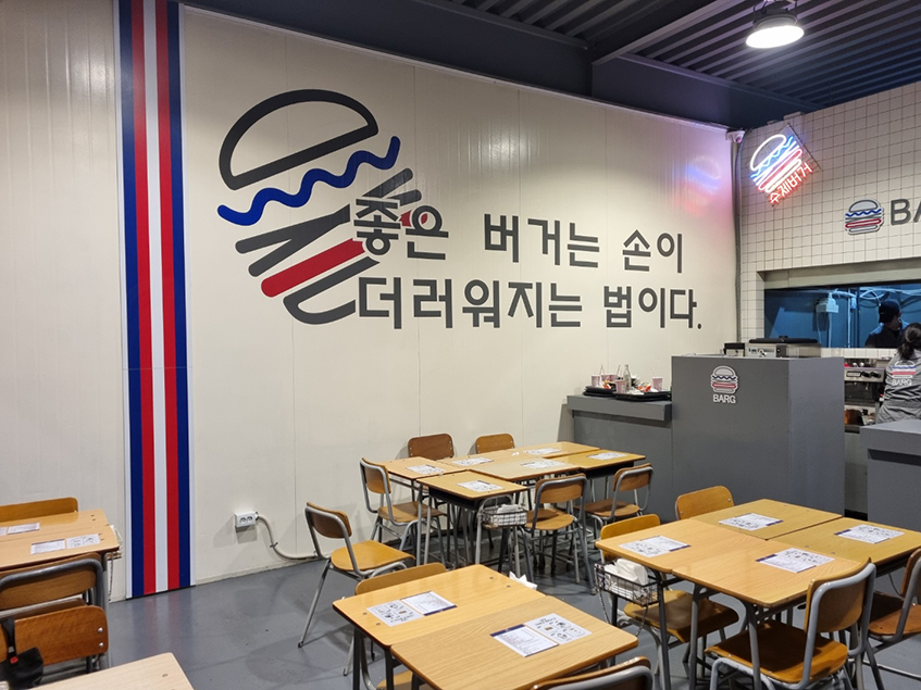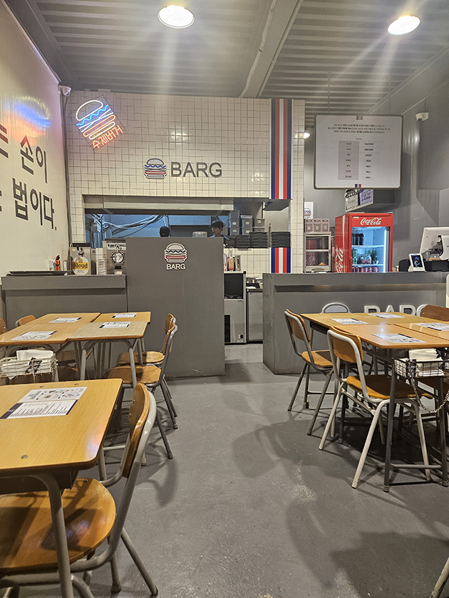 파주 바그 수제 햄버거 매장에 들어섰을 때, 첫인상이 정말 좋아서 기대감이 높아졌어요. 실내는 깔끔하고, 약간 힙한 감성도 느껴졌죠. 테이블 간 간격도 넉넉해서 가족 단위 손님들이 많았어요. 특히 오픈 키친 스타일이라 음식 준비 과정을 멀리서 볼 수 있는데, 이게 또 믿음직스럽더라구요.