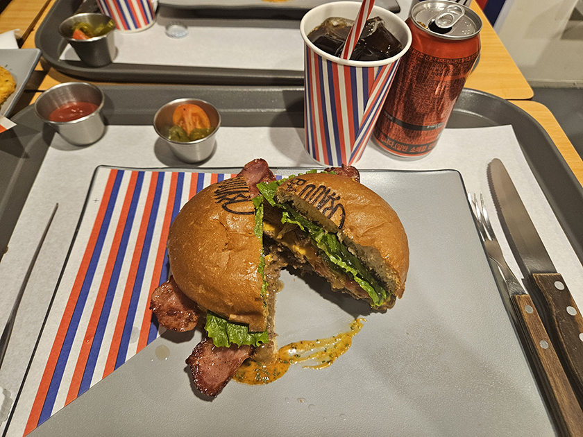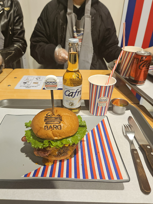 메뉴는 키오스크로 주문했는데, 바그 종류가 다양해서 한참 고민했어요. 클럽샌드위치 느낌의 바그부터, 치킨 바베큐 바그까지 선택지가 너무 많더라고요. 시그니처 바그는 '톰스테이크바그'인데, 바삭한 번에 육즙 폭발하는 패티와 싱싱한 야채가 조화를 이루어 진짜 강추드려요. 추가로 맥주 한잔에 콜라까지 곁들이면 먹기 좋다고 해서 주문! 주말에는 사람이 많으니 재료 소진될 수도 있으니, 점심시간 전에 가는 거 추천할게요.