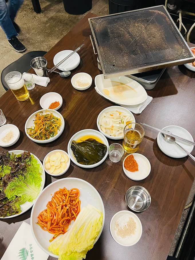 먼저 깜짝 놀란 건 기본으로 나오는 선지해장국! 따끈하고 깊은 국물 맛이 고기 나오기 전에 속을 완벽히 준비시켜 줘요. 여러 가지 깔린 밑반찬도 모두 신선했고, 고기와 찰떡궁합인 배추 속과 무생체가 특히 눈길을 끌었습니다.