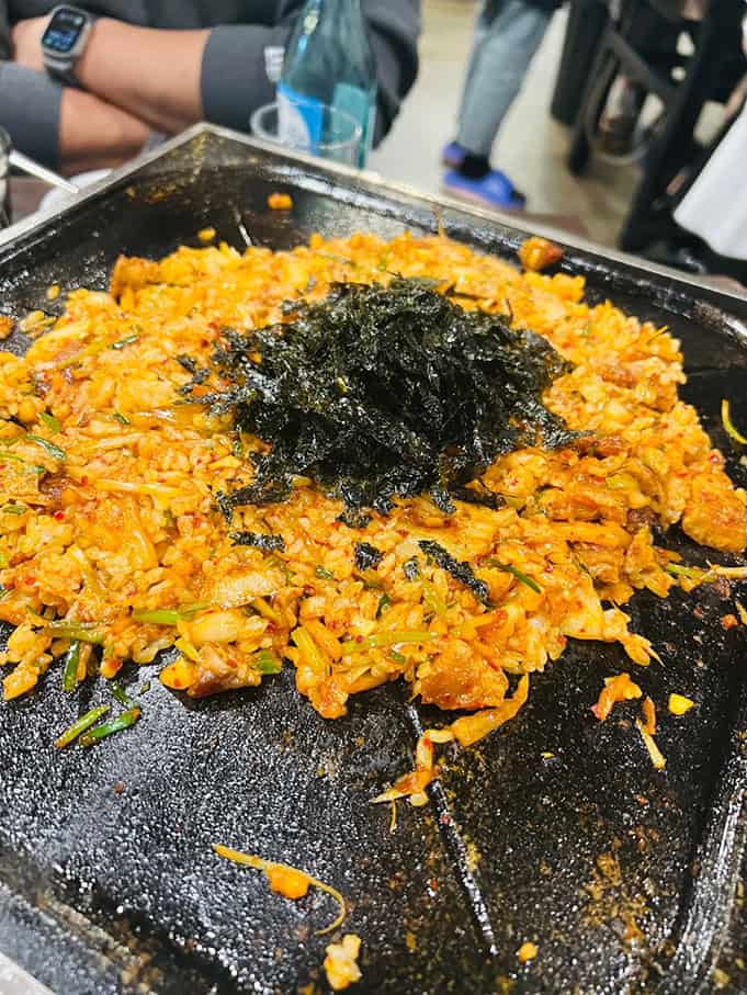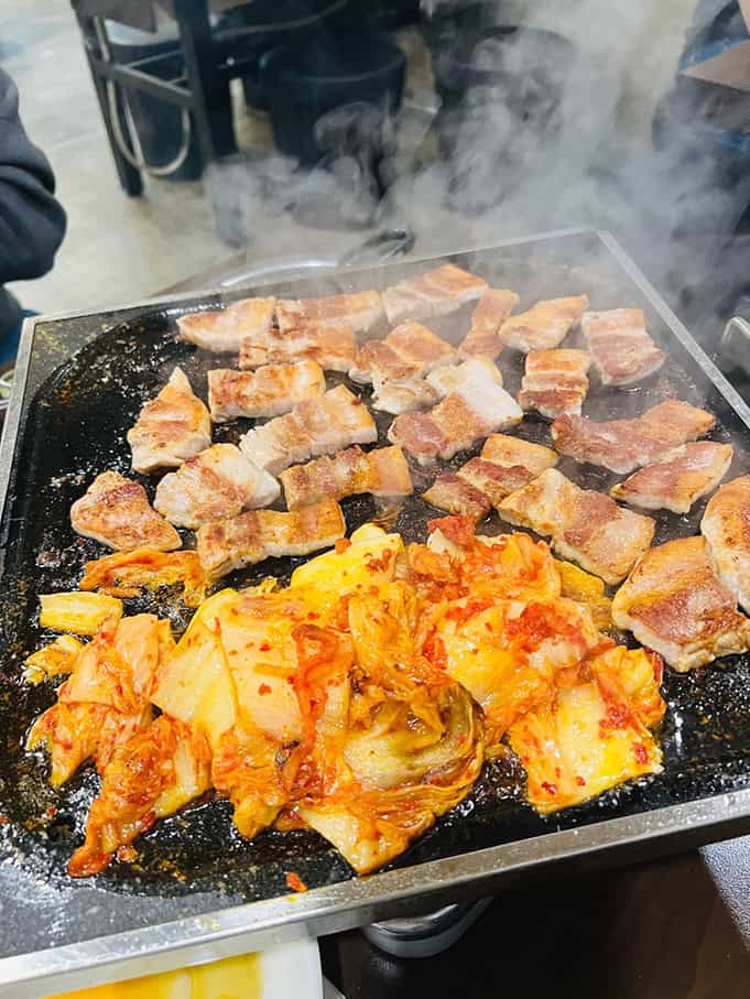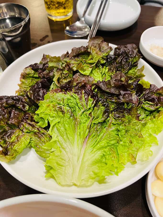 이건 그냥 고기랑 먹어야 제대로다 싶은 느낌이었어요. 식당 측에서 추천한 먹는 방법은 삼겹살을 배추와 무생체에 싸서 한입에 먹는 것! 솔직히 처음 먹어보는 조합이라 얼마나 맛날지 의심했지만, 한입 베어 물고 바로 감탄했죠. 그 조화란!
