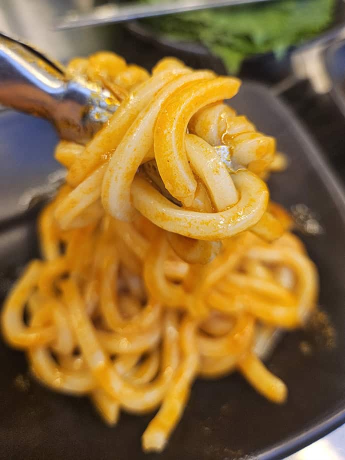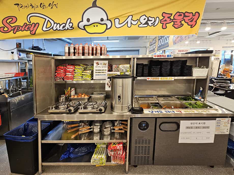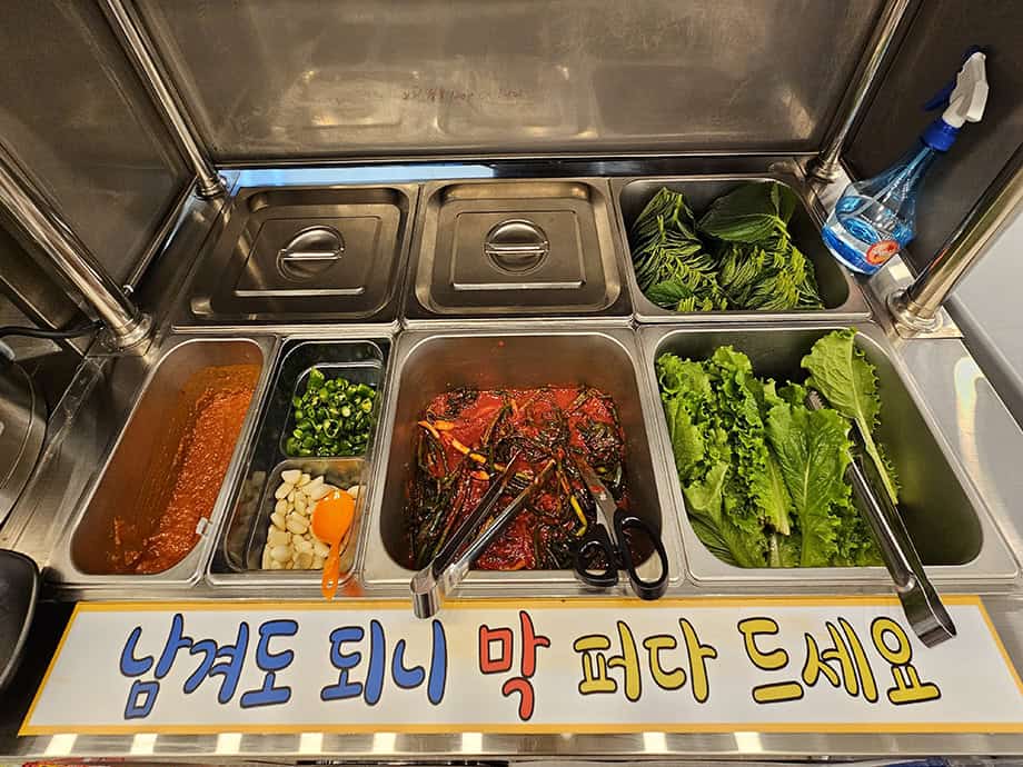 남부터미널맛집 나오리주물럭의 하이라이트는 바로 셀프 코너! 기본 반찬부터 쌈채소, 파김치, 밥까지 직접 셀프바에서 가져오는 방식이에요. 라면 코너에는 열라면, 칼국수 사리까지 있어서 원하는 대로 끓여먹을 수 있어요.