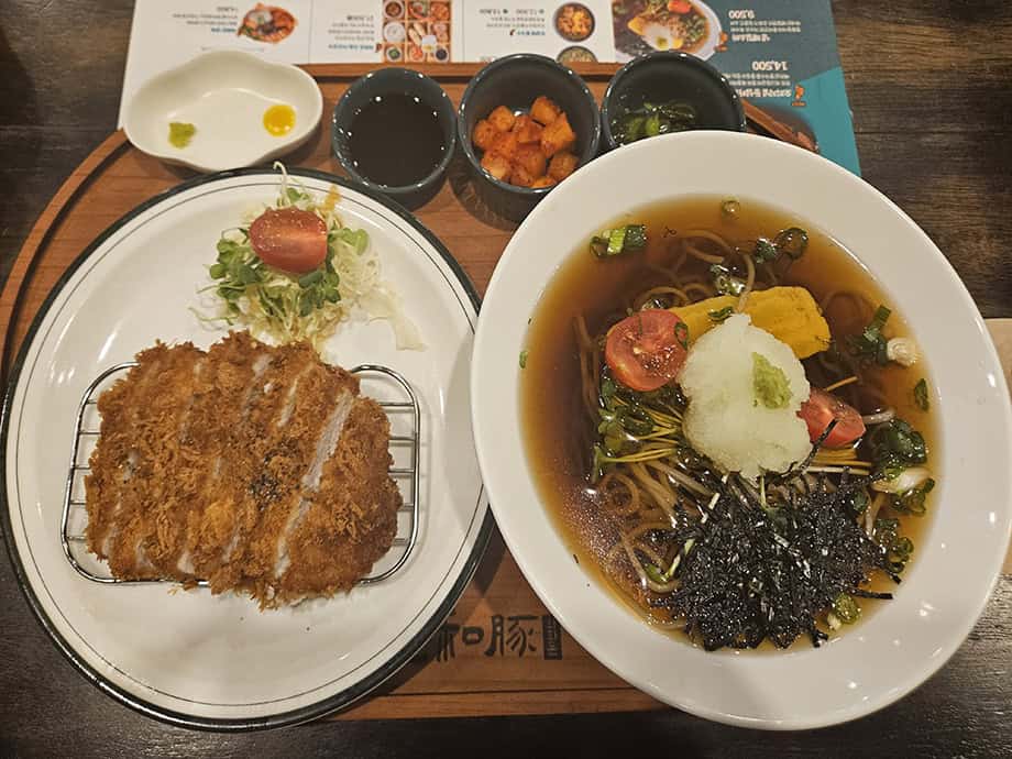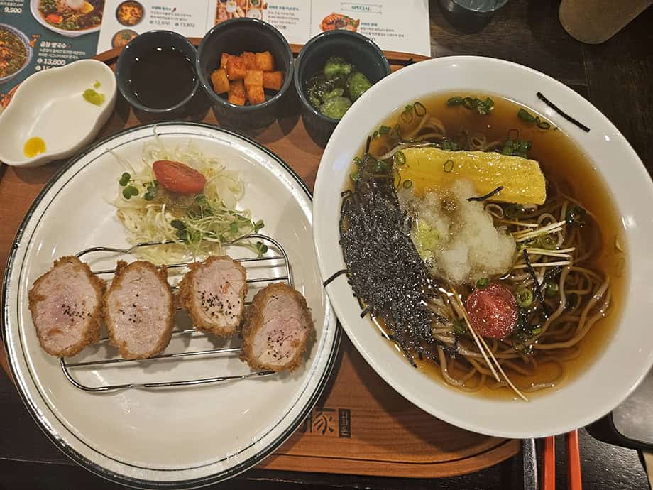 저는 개인적으로 냉모밀과 돈카츠 세트 구성을 먹으며 너무 만족했는데요, 여기서 감동 받은 건 메뉴를 주문하면 세팅되어 나오는 상차림에 국물 맛이나 고기 상태가 정말 정성스럽다는 게 느껴졌기 때문이에요.
