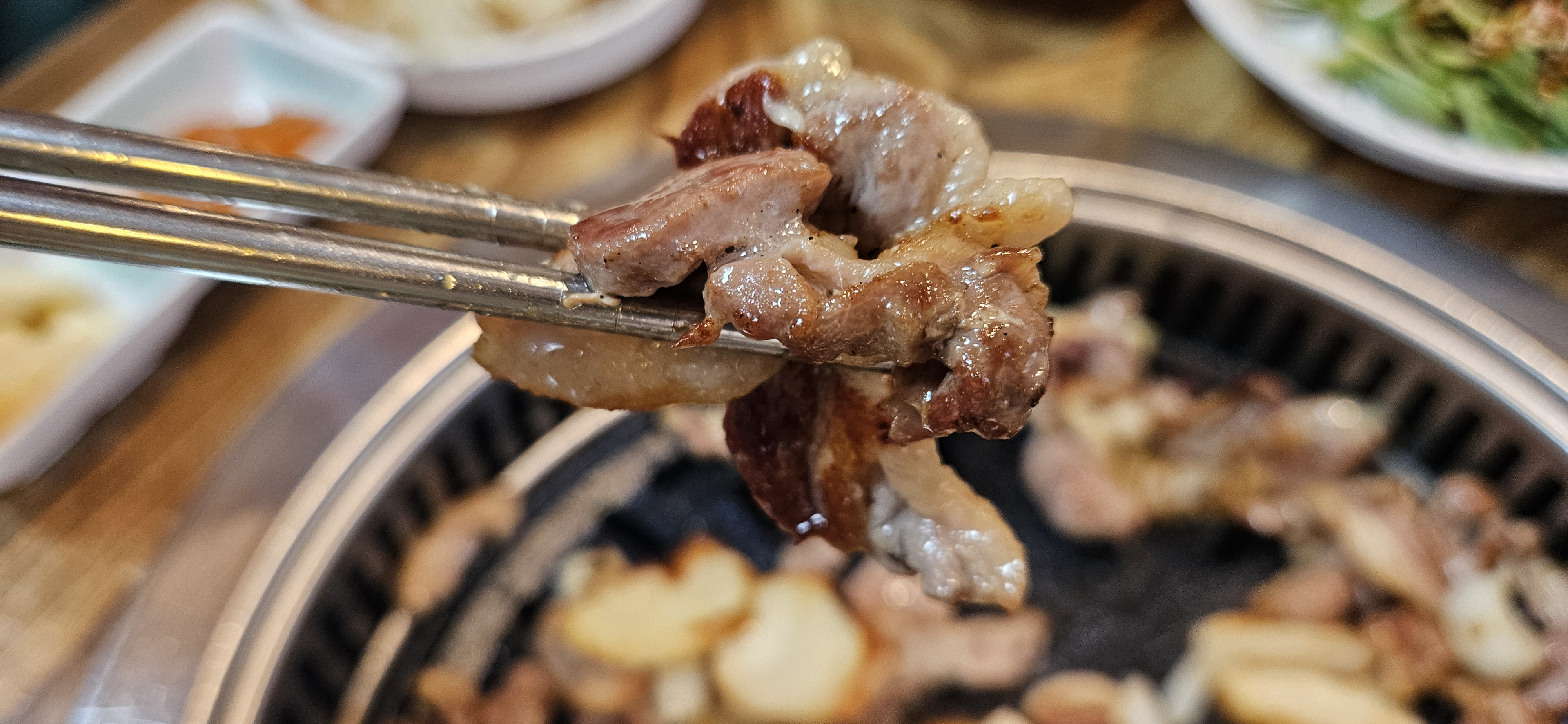 오리만 먹으면 괜찮겠지 했는데, 반찬을 보니 이 식당의 진심이 느껴지더라고요. 대표적인 곁들임으로 깻잎쌈에 싸먹는 오리구이와 신선한 야채, 그리고 간장소스까지 정말 골고루 갖춰져 있었어요. 생오리로스는 담백하게 익혀서 부드러운 식감을 그대로 살렸습니다. 간이 딱 맞아서 입맛에 딱이었어요. 확실히 이건 단순 고기 맛이 아닌, 다양한 맛의 하모니를 느낄 수 있는 조합이었어요.