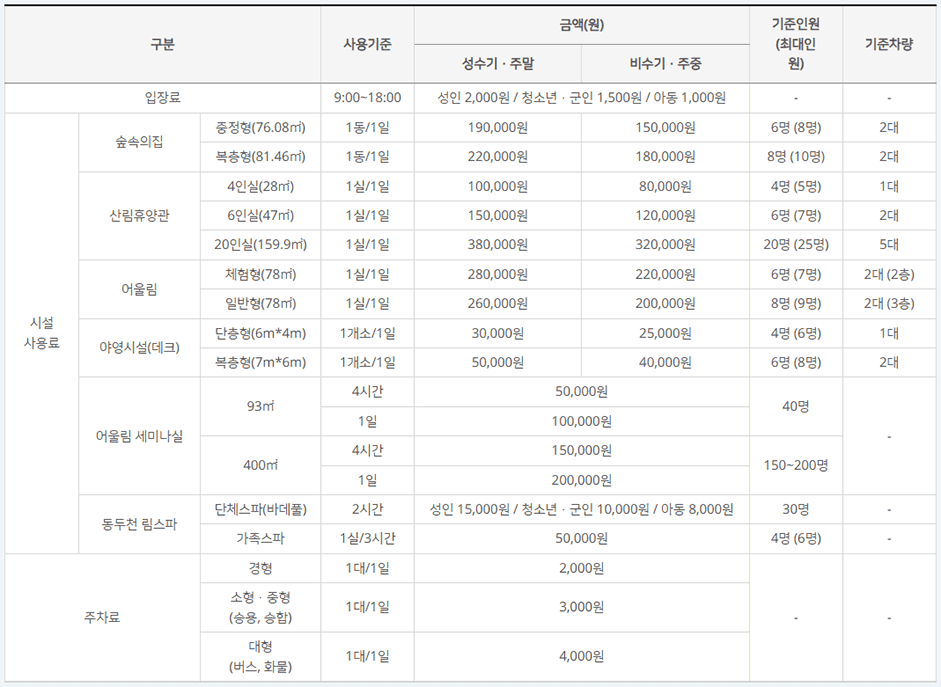 ※숙박시설 기준인원 초과 시 1인당 10,000원(야영데크, 림스파 가족스파는 5,000원) 추가징수, 최대인원 초과 입장 불가