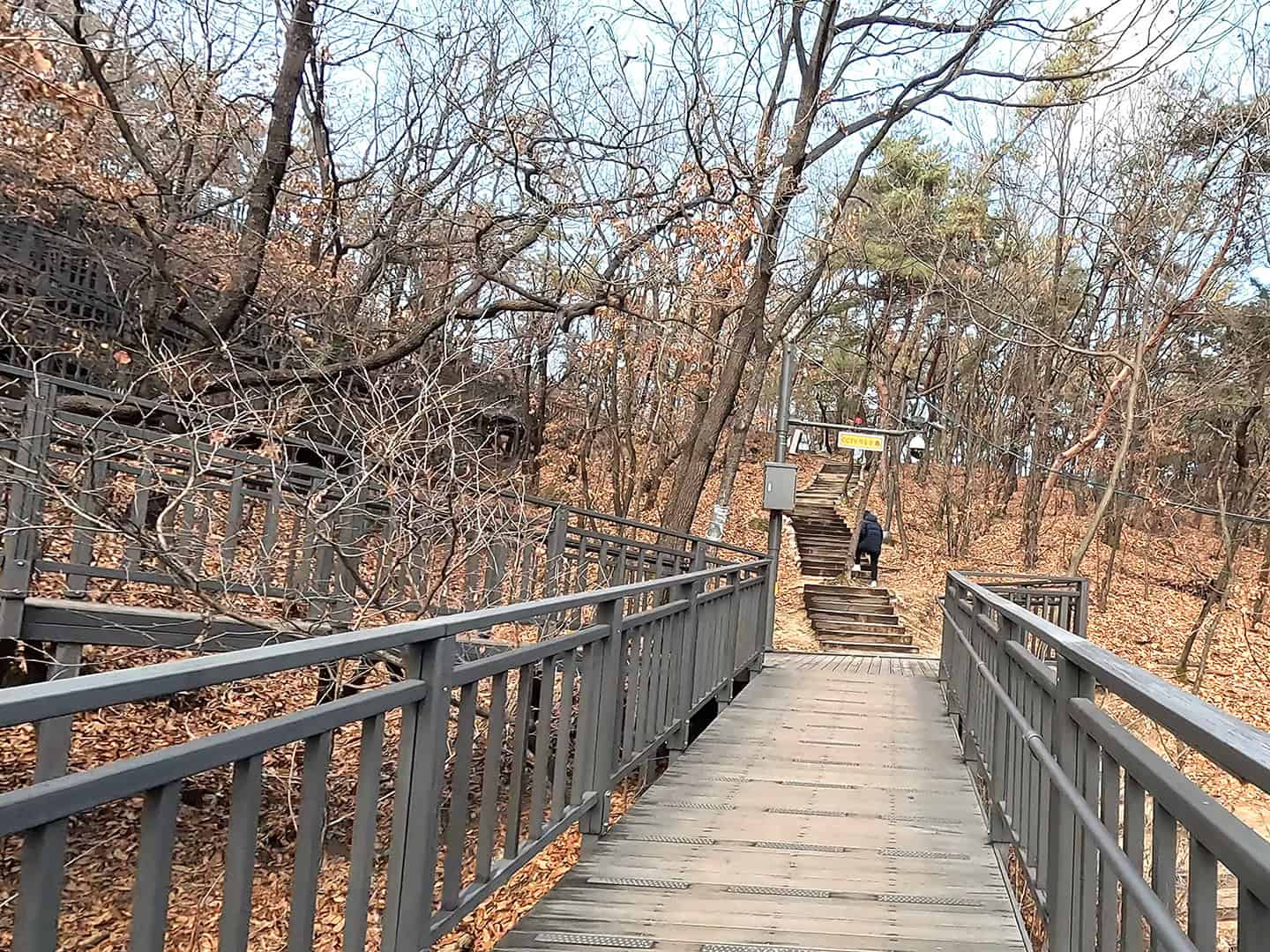 봉화산 동행길의 핵심은 데크길이랍니다. 폭이 넓고 난간이 있어 눈비가 와도 발이 흔들리지 않아요. 낙엽 밟는 소리와 함께 미끄럼 방지 패드가 곳곳에 깔려 있어 겨울에도 부담이 적었고, 쉼터와 벤치가 자주 나와 리듬 있게 쉴 수 있었어요.