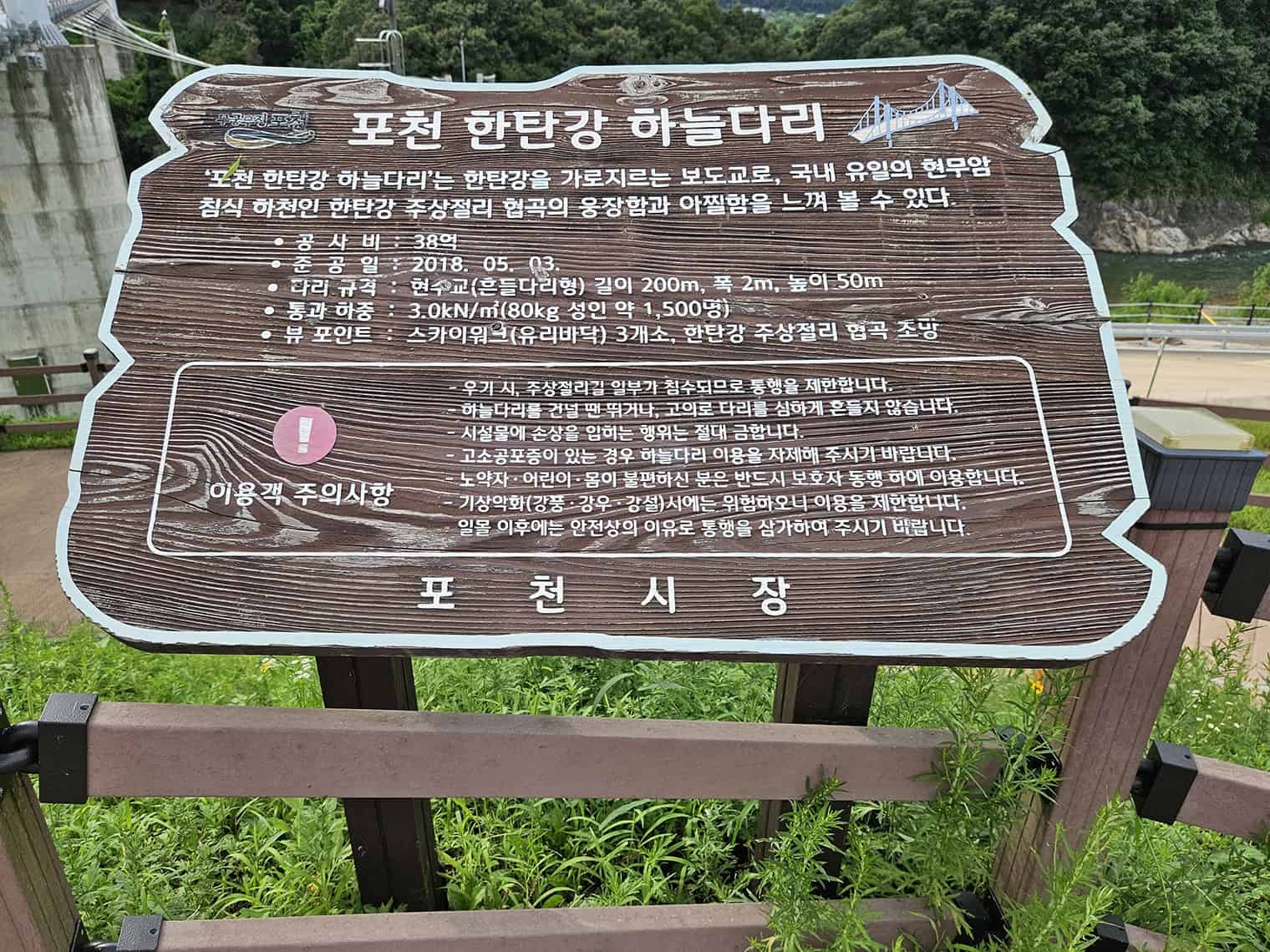위치는 포천 영북면에 자리 잡고 있어 주변 자연 풍경이 한 폭의 그림 같아요. 주차장에서 도보로 다리 입구까지는 약 5분 거리라 접근도 정말 간단해요!