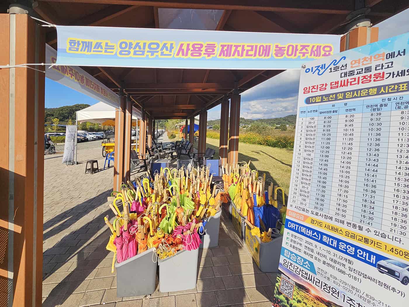 넓은 주차장에 차를 대고 입구로 걸어가면 우선 알록달록 우산 대여대가 반겨요. 햇살 강한 시간엔 그늘처럼 쓰기 좋고 사진 소품으로 포인트가 되더라고요. 현장엔 지역 카페와 먹거리 부스도 있어 간단히 즐기기도 좋답니다.