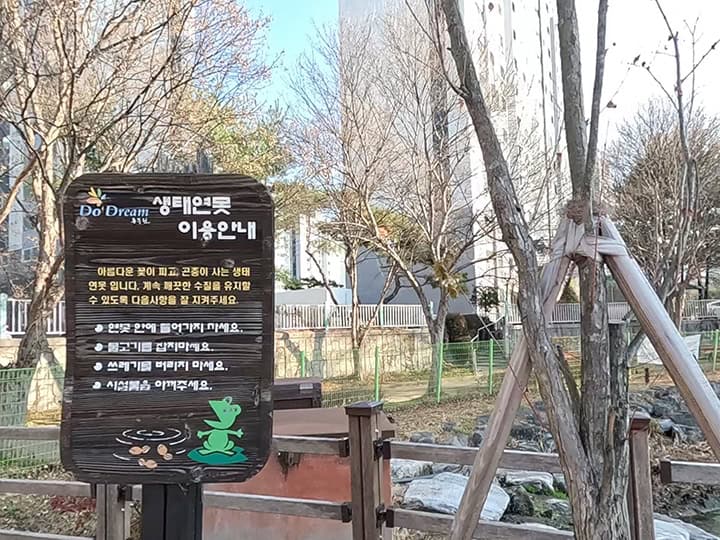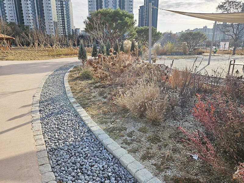 코스 끝엔 발을 털고 앉아 쉴 수 있는 벤치가 있어 동선도 자연스럽게 이어졌어요. 생태연못 구역은 규모가 크진 않지만, 내년 봄이 되면 멋진 모습을 보여 줄 것으로 기대합니다.