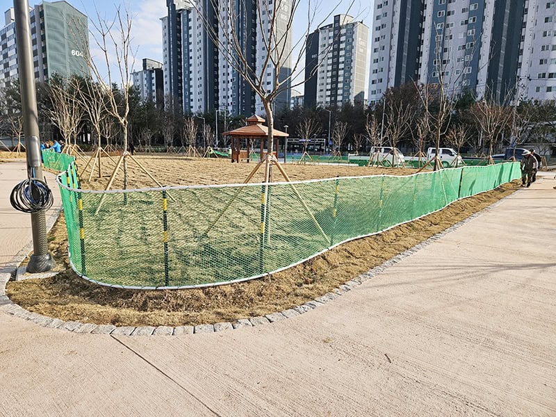 반려견과 함께 걷는 분들을 위해 한쪽에 애견동반 전용공간이 마련된 점이 가장 반가웠어요. 녹색 그물망으로 경계를 두어 안정감 있고, 바로 가운데에 정자가 있어 보호자는 눈으로 보며 쉬기 편할 것 같아요.