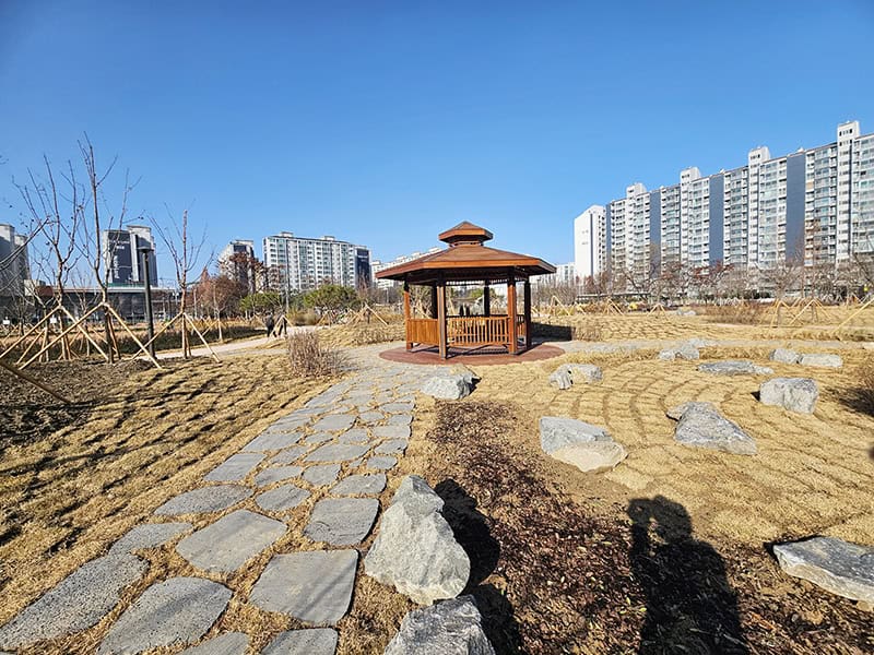 여러 곳의 입구 중에 어느 곳으로 진입해도 구역별 콘셉트를 한 번에 볼 수 있어 초행도 이용하기가 쉬웠습니다. 화단은 봄꽃과 가을 수종을 섞어 사계가 또렷하고, 원형 데크 정자는 햇살을 적당히 걸러 낮에도 편안한 쉼터를 제공했어요.