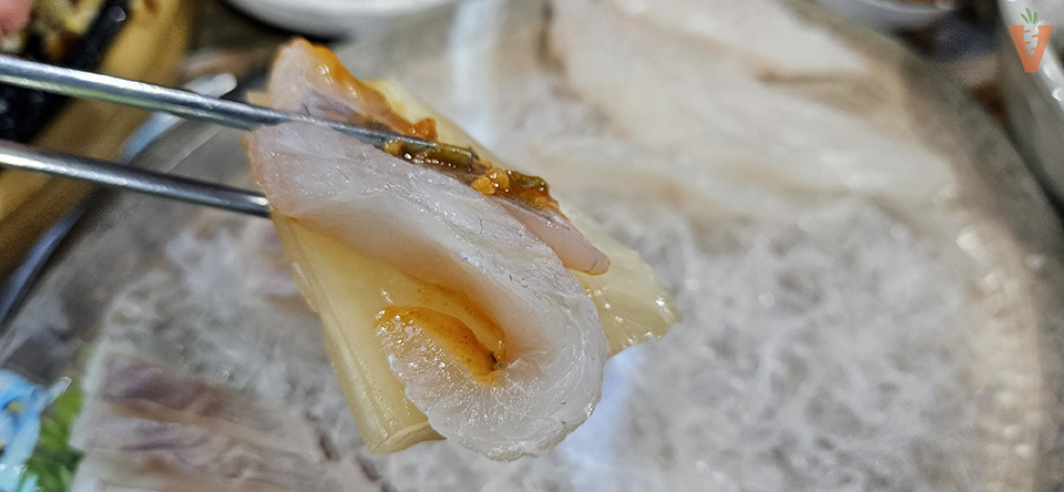 김치와 회를 양념된장에 듬뿍 찍어 먹는