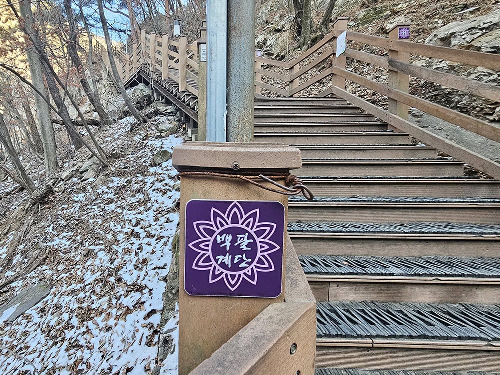 원효굴 이후에는 자재암으로 향하는 108계단이 나타나요. 숫자만 보면 부담스럽게 느껴질 수 있지만, 실제로는 계단 높이가 낮고 중간중간 숨을 고를 수 있어 천천히 오르면 크게 힘들지 않답니다.