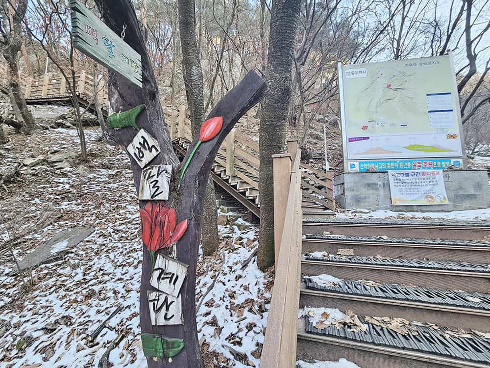 입구부터 산책로가 잘 정비돼 있어 등산 장비 없이도 편하게 이동할 수 있어요. 겨울철에도 눈이 많이 쌓이지 않으면 일반 운동화로도 충분히 걸을 수 있답니다. 다만 108계단 구간을 고려하면 미끄럼 방지 기능이 있는 신발이 더 안전해 보여요.