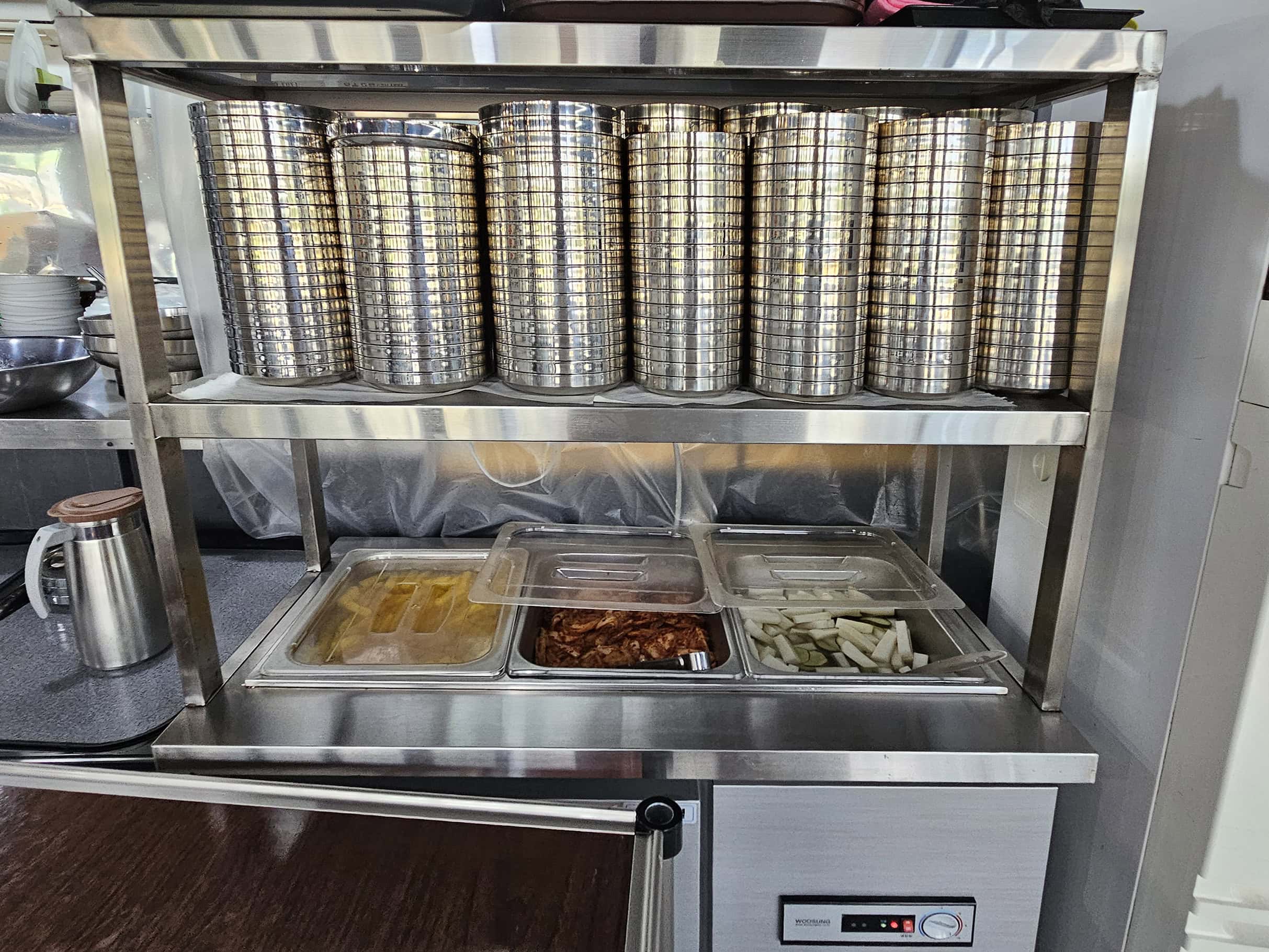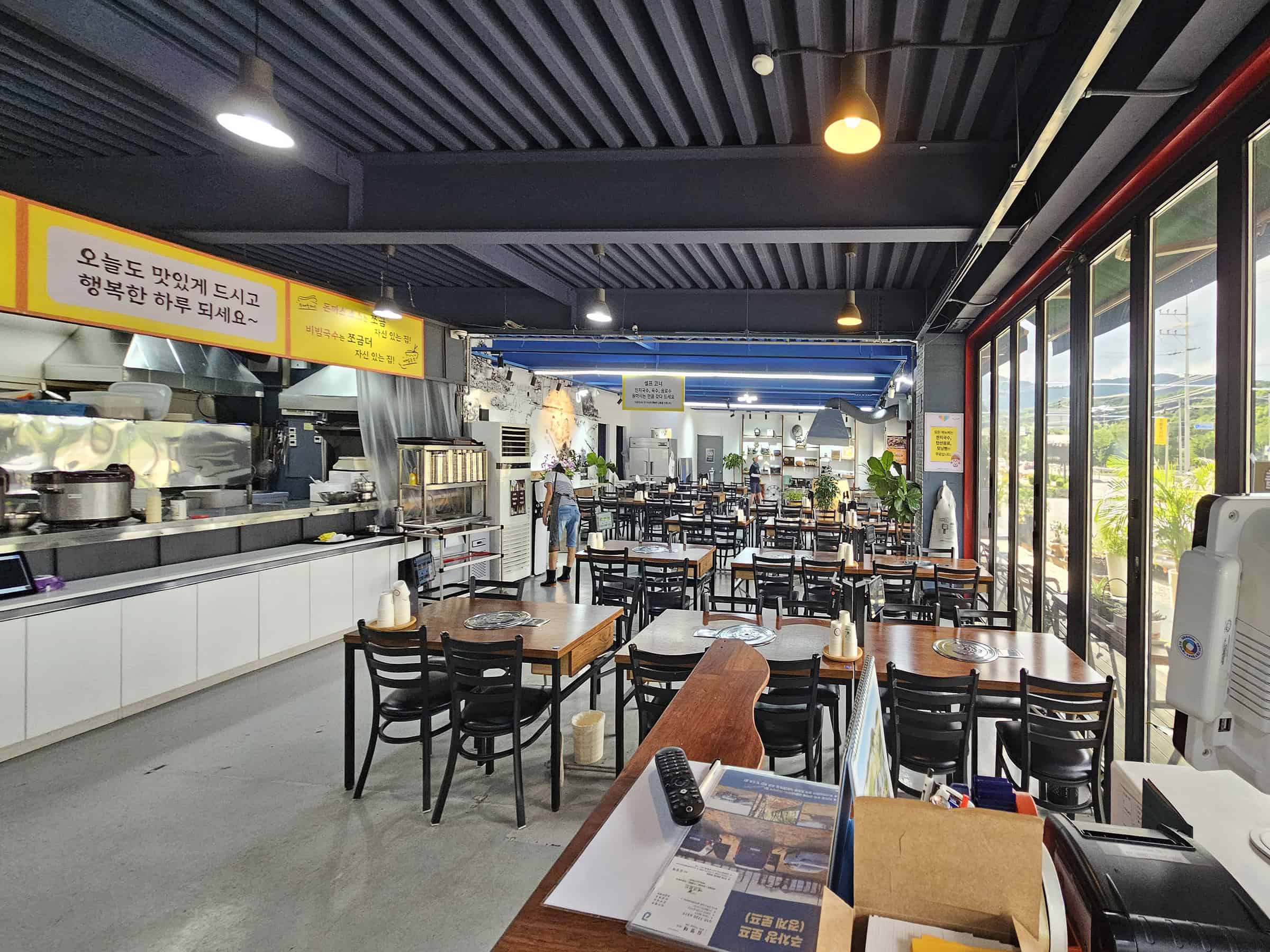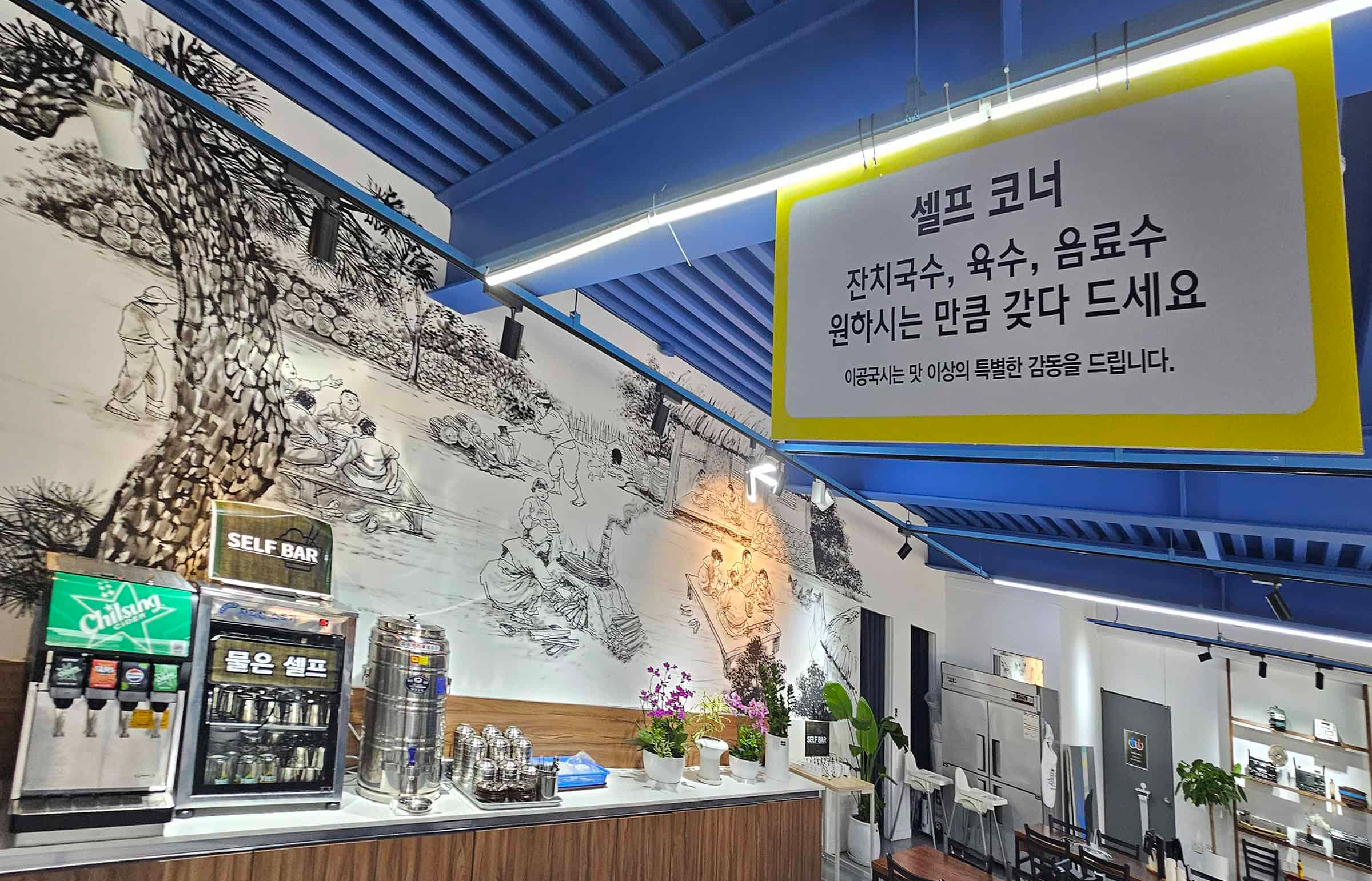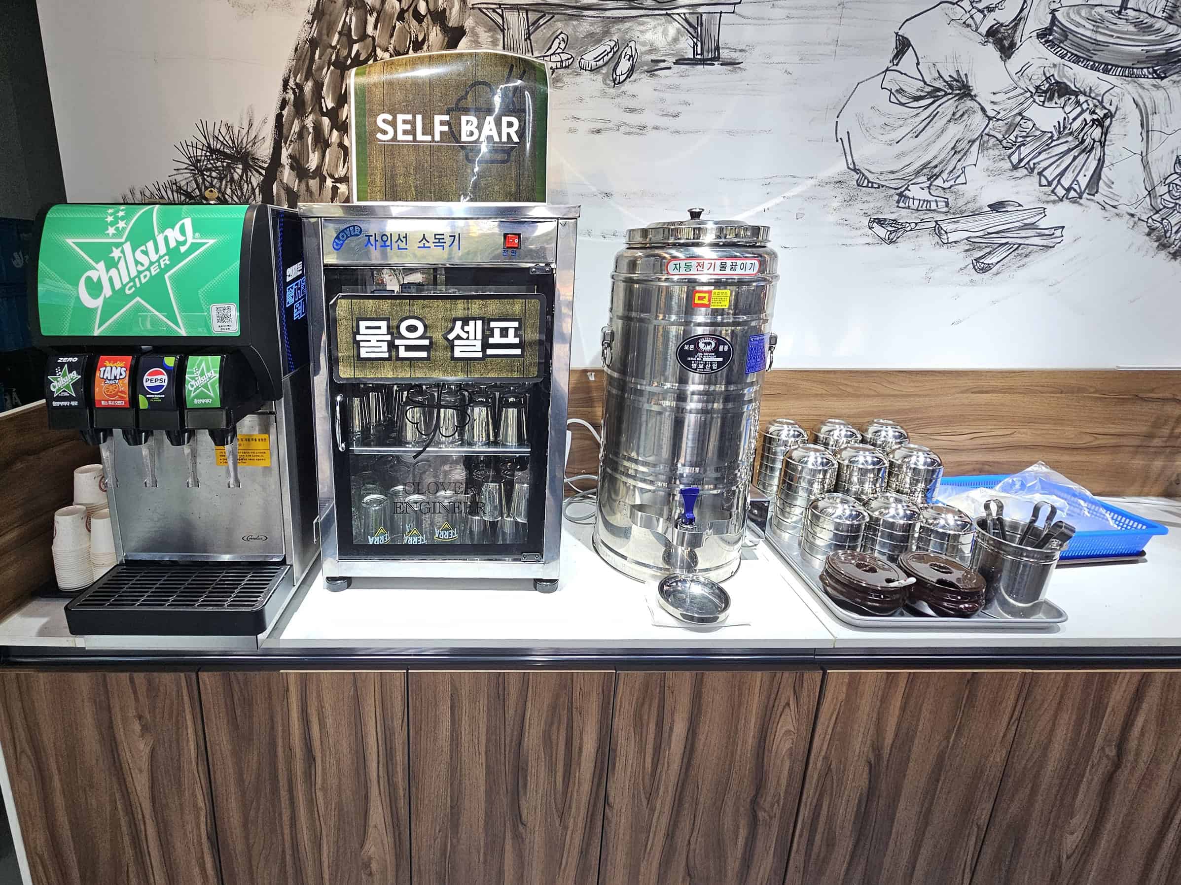 테이블 간격도 넓어 프라이버시가 보장되는 느낌이 정말 좋아요. 웬만하면 다들 좋아하는 잔치국수 같은 셀프 메뉴 코너도 깔끔하고 쾌적했답니다.