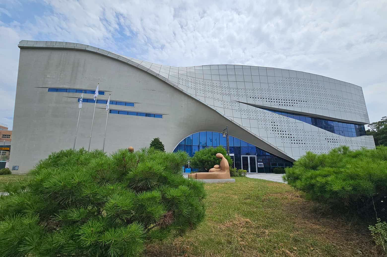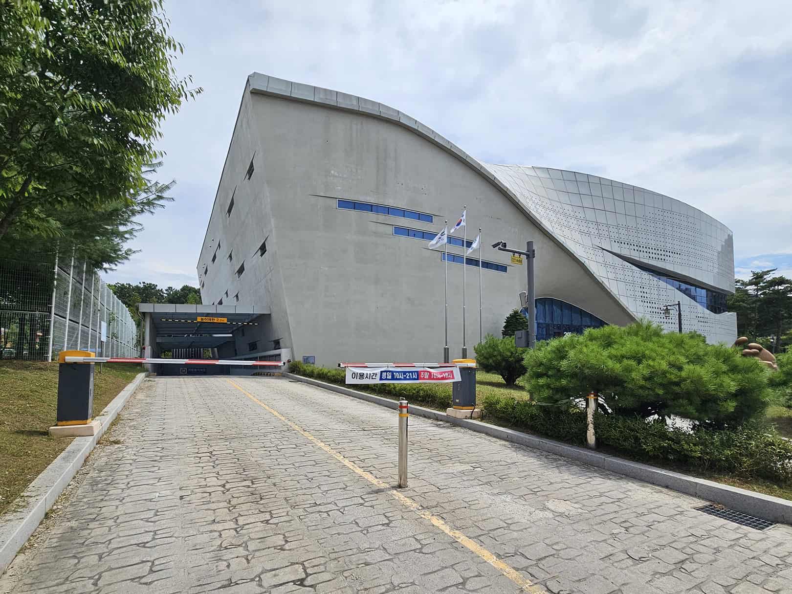 입구에 들어서면 가장 먼저 눈길을 사로잡는 건 건물의 독특한 외관이에요. 대형 미술 작품 같은 조형물과 함께 깔끔하지만 개성 있는 건축물이 눈에 띄더라고요.