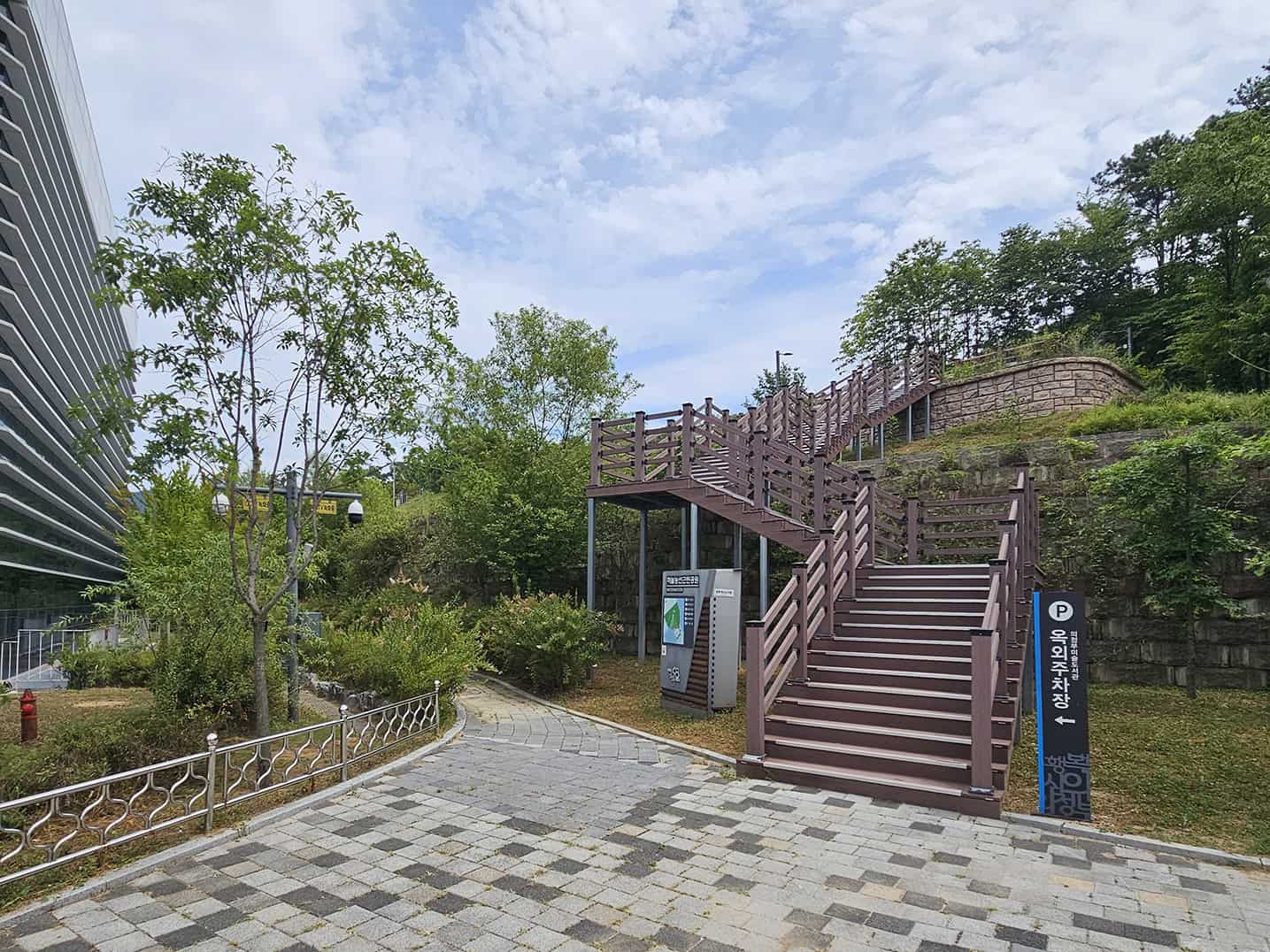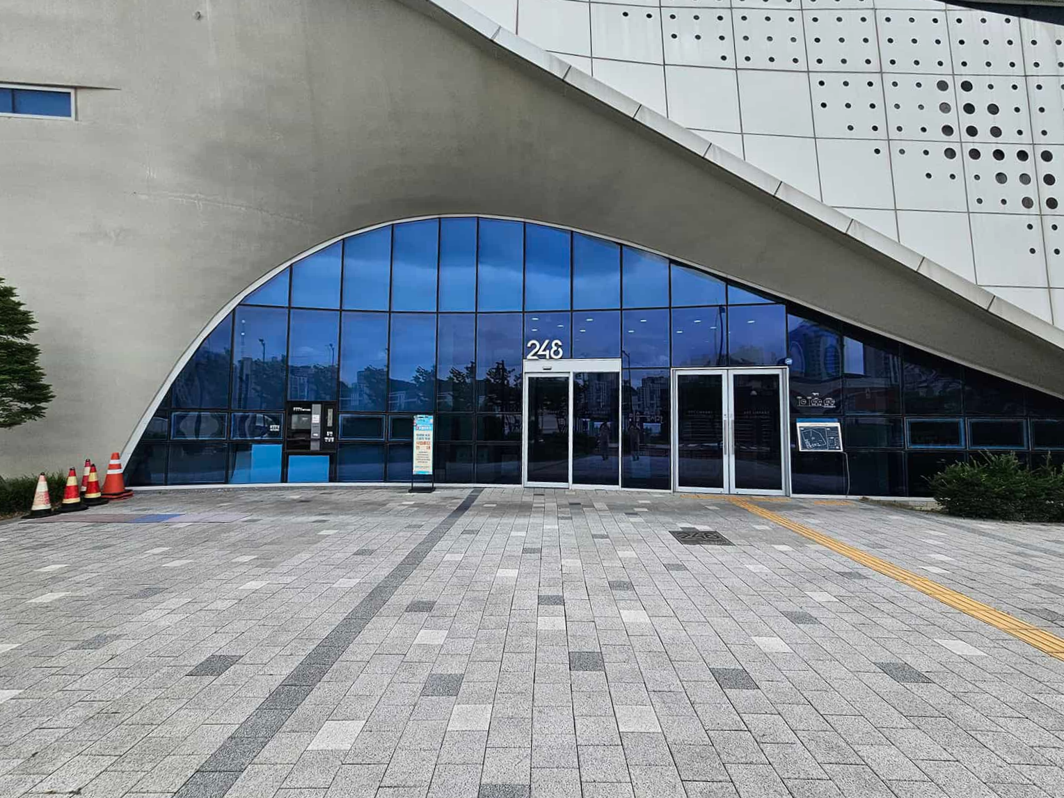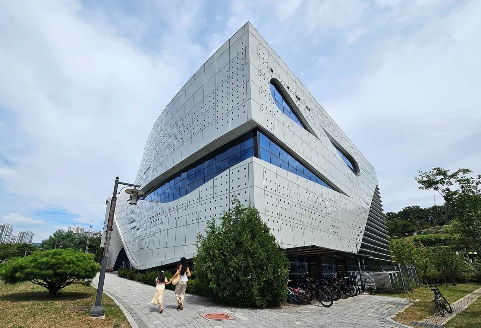 입구에 들어서면 가장 먼저 눈길을 사로잡는 건 건물의 독특한 외관이에요. 대형 미술 작품 같은 조형물과 함께 깔끔하지만 개성 있는 건축물이 눈에 띄더라고요.