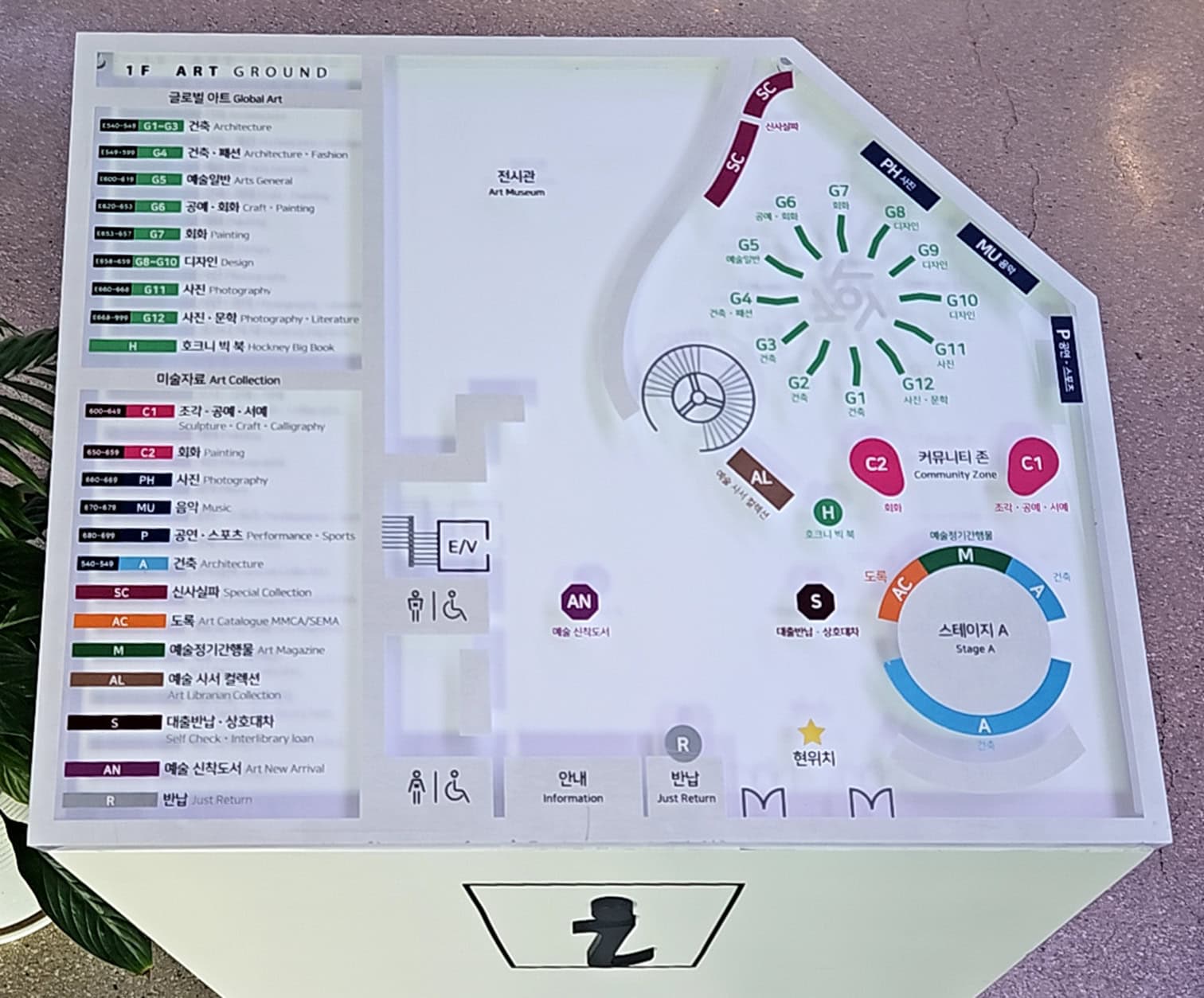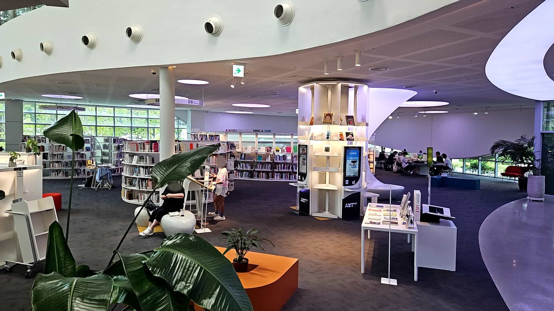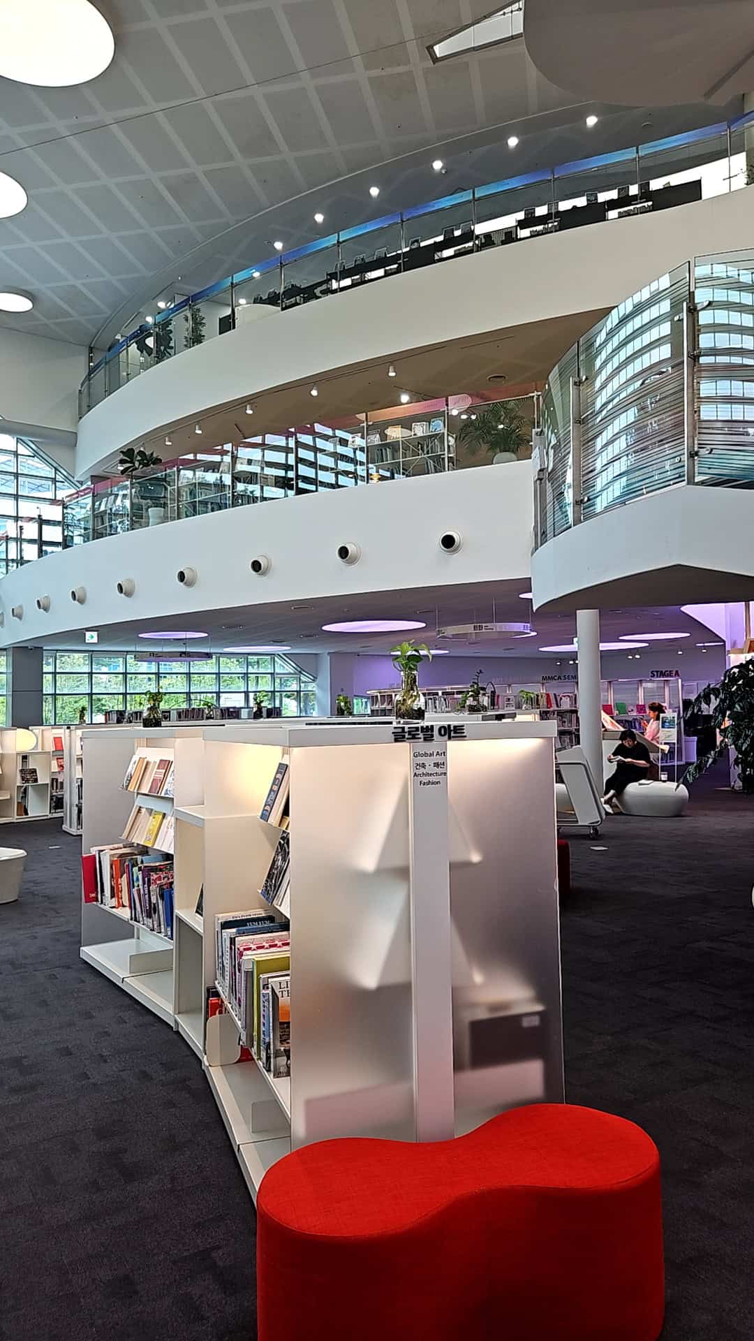 ▶ 1층: [ART GROUND]조용히 책을 읽거나 공부에 몰두할 수 있는 열람실. 글로벌 아트(건축, 패션, 예술일반, 공예, 회화, 디자인, 사진, 문학, 호크니 빅 북) 미술자료(조각, 공예, 서예, 회화, 사진, 음악, 공연, 스포츠, 건축, 토목, 신사실파, 예술정기간행물, 예술 사서 컬렉션) 대출, 상호대차, 신착도서, 반납 등으로 잘 꾸며져 있어요.